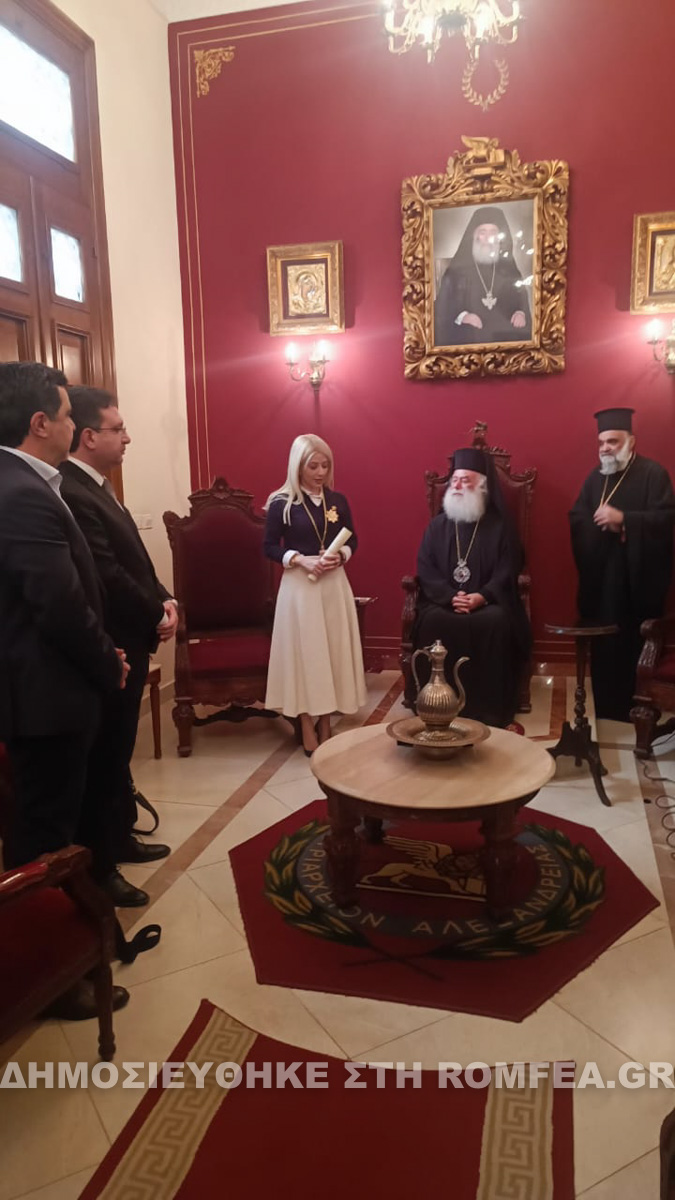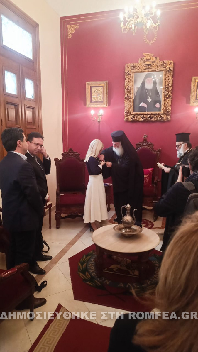 Εις ένδειξη τιμής και αναγνωρίσεως των πολλών ευεργεσιών της κ. Προέδρου προς το Παλαίφατο Πατριαρχείο Αλεξανδρείας ο Μακαριώτατος την πρρικόσμησε με τον Ανώτατο Ταξιάρχη μετά αστερος του Αγίου Σάββα του Ηγιασμένου.