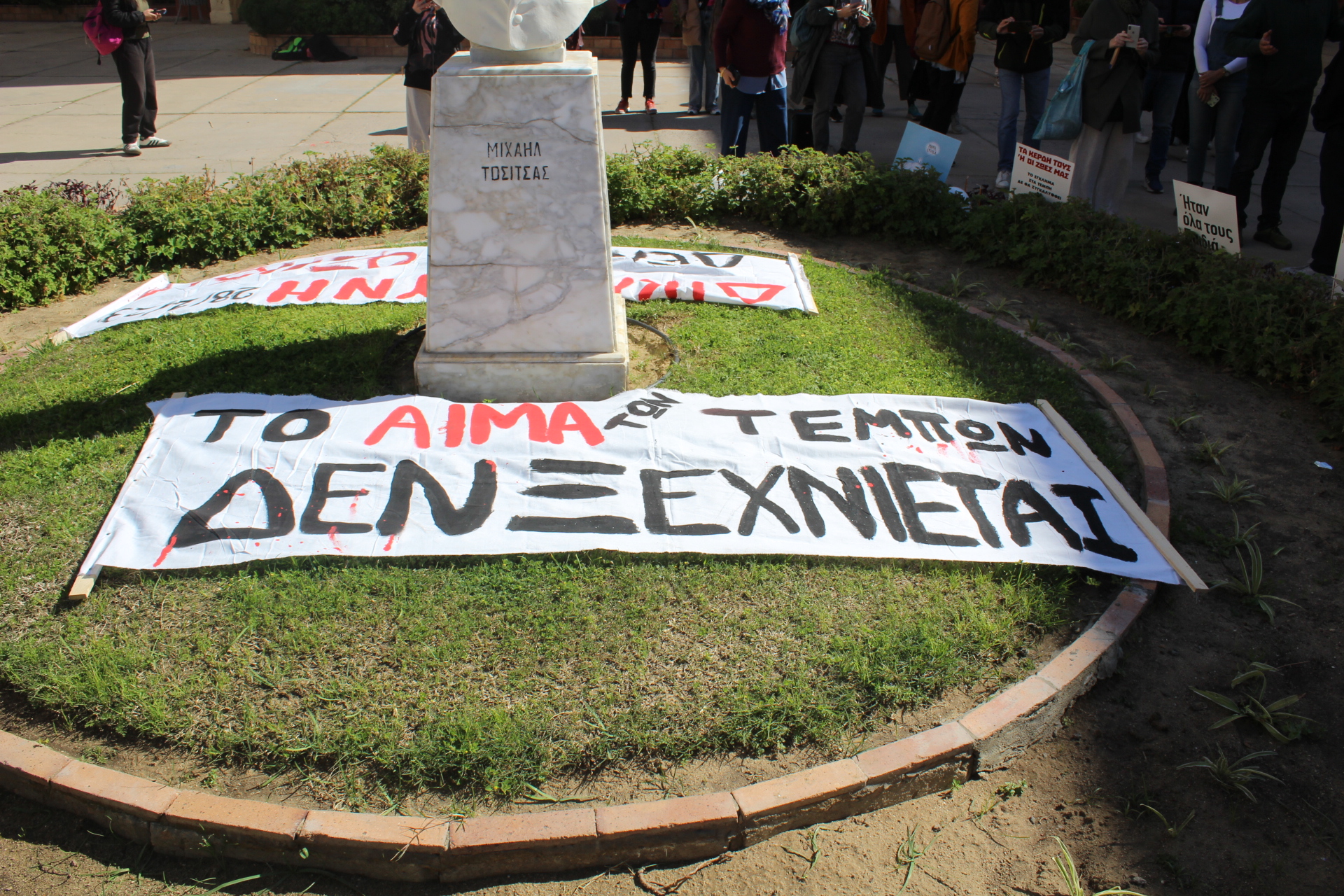Η ειρηνική, ευσεβής και σεμνή τελετή έλαβε τέλος, με την εναπόθεση των κεριών, των πανό και των πλακάτ, στο κυκλικό κηπάριο όπου δεσπόζει η προτομή του Μεγάλου Ευεργέτη Μιχαήλ Τοσίτσα, εν είδει συμβολικού μνήματος… με την ευχή να αποδοθεί ΔΙΚΑΟΣΥΝΗ!