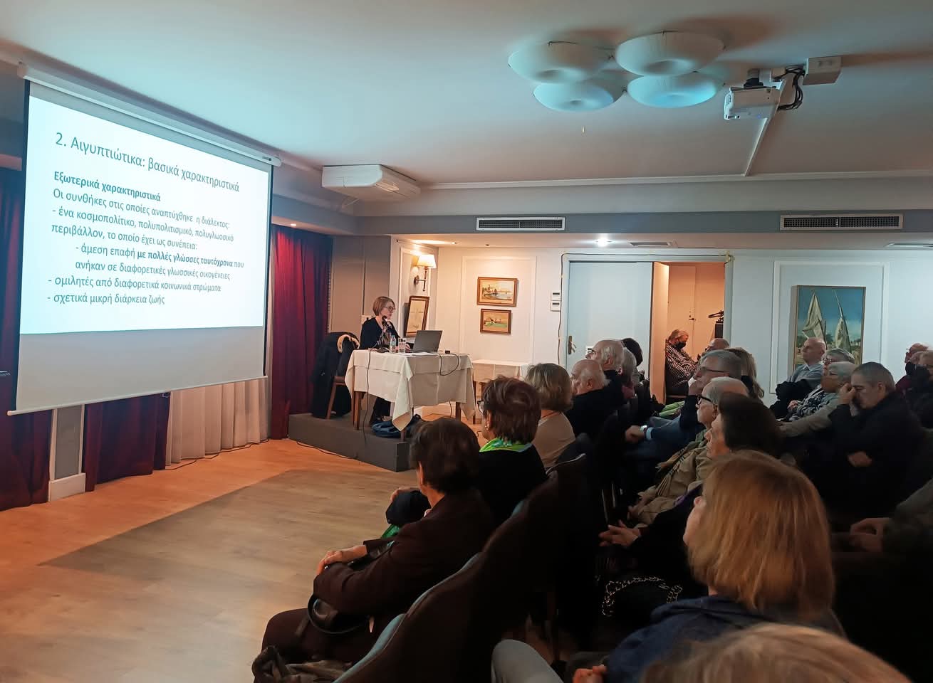 Την Δευτέρα 10 Μαρτίου 2025, τα μέλη και φίλοι του Συνδέσμου Αιγυπτιωτών Ελλήνων είχαμε την τύχη να παρακολουθήσουμε μια εξαιρετική ομιλία της Ρέας Δελβερούδη, Καθηγήτρια Γενικής Γλωσσολογίας – Ιστορίας γλωσσικών ιδεών του Τμήματος Γαλλικής Γλώσσας και Φιλολογίας του ΕΚΠΑ (Πανεπιστήμιο Αθηνών), με θέμα τα «Αιγυπτιώτικα: ένα γλωσσικό ιδίωμα υπό εξαφάνιση (;)»