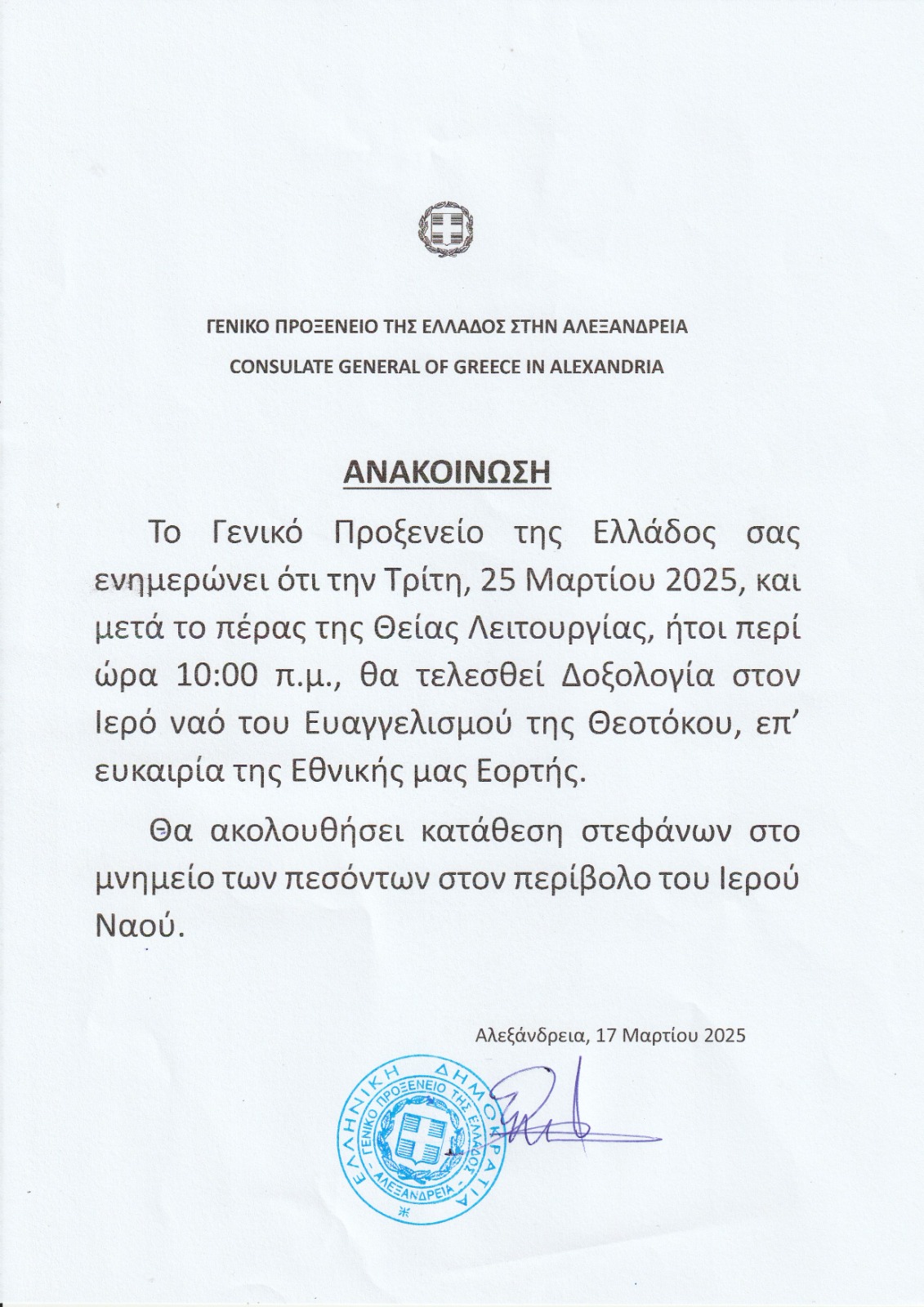 ΓΕΝΙΚΟ ΠΡΟΞΕΝΕΙΟ ΤΗΣ ΕΛΛΑΔΑΣ ΣΤΗΝ ΑΛΕΞΑΝΔΡΕΙΑ