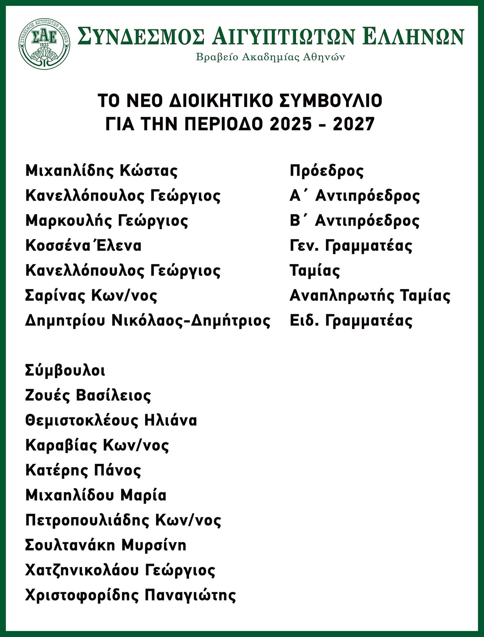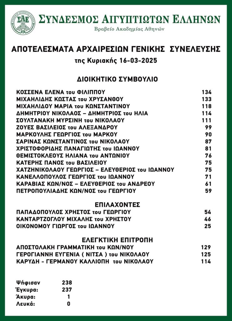 Η Ελληνική Κοινότητα Αλεξανδρείας. συγχαίρει τον Σύνδεσμο Αιγπτιωτών Ελλήνων για την άψογη διενέργεια των Αρχαιρεσιών και εύχεται σε όλους τους εκλεγμένους και το νέο ΔΣ, να έχουν πάντα επιτυχίες και ο ιστορικός ΣΑΕ, να συνεχίσει να αποτελεί για όλους τους Αιγυπτιώτες, σημείο πολιτισμικής και ιστορικής αναφοράς!
