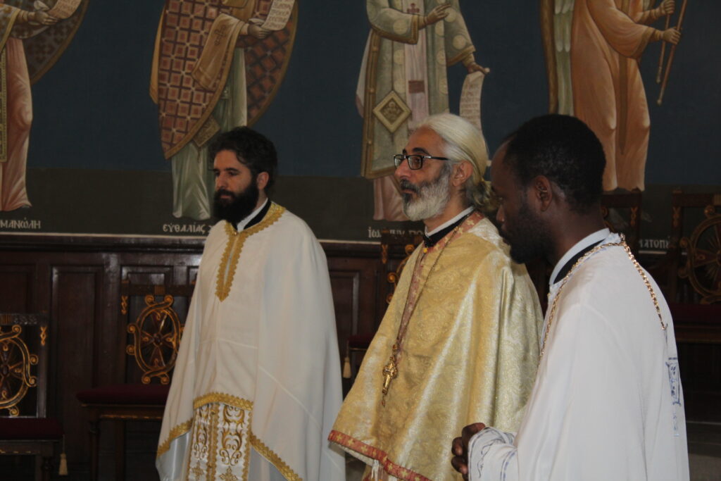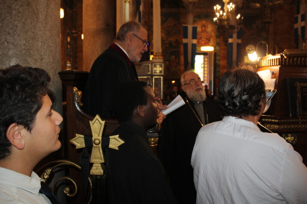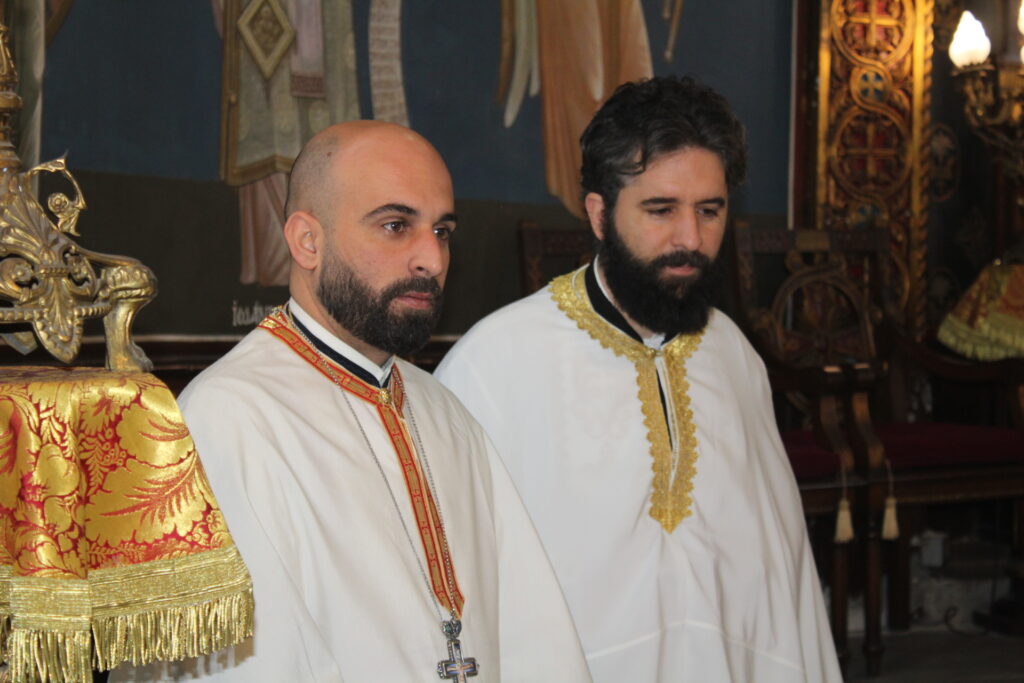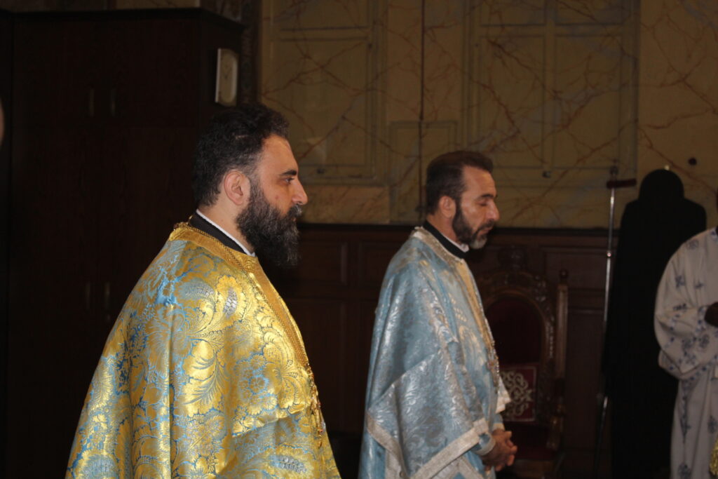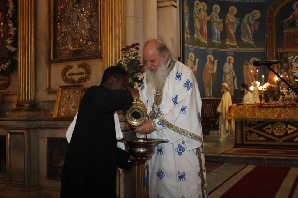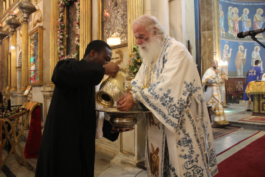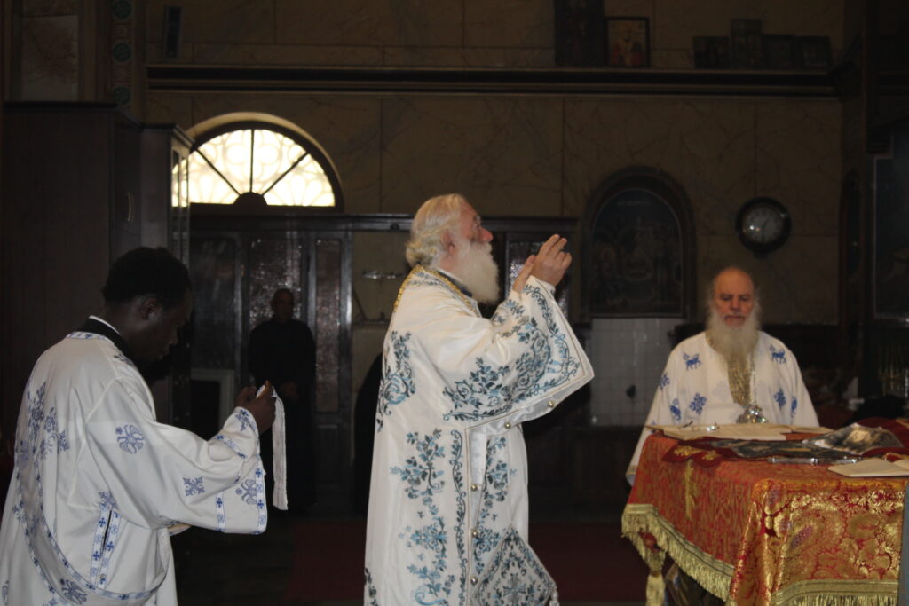 Ο Μακαριώτατος Πάπας και Πατριάρχης Αλεξανδρείας και Πάσης Αφρικής κ.κ. Θεόδωρος Β’, προεξήρχε της Θείας Λειτουργίας, με συλλειτουργούς τους Σεβασμιότατους Μητροπολίτες: Γέρων Λεοντοπόλεως κ. Γαβριήλ, Γενικό Πατριαρχικό Επίτροπο, Πτολεμαΐδος κ. Παντελεήμονα Αρχιγραμματέα της Ιεράς Συνόδου, Ταμιάθεως κ. Γερμανό Προϊστάμενο της Ιεράς Μονής του Οσίου Σάββα του Ηγιασμένου και τον Πανοσιολογιότατο Αρχιμανδρίτη κ. Δαμασκηνό Πατριαρχικό Επίτροπο, μαζί με τον Πατέρα Ανδρέα, τον αραβόφωνο ιερέα Σάμυ και μαθητές της Πατριαρχικής Σχολής Άγιος Αθανάσιος. Έψαλλαν οι ιεροψάλτες Αλέξανδρος Μπάσης και Ιωάννης Γενειατάκης.