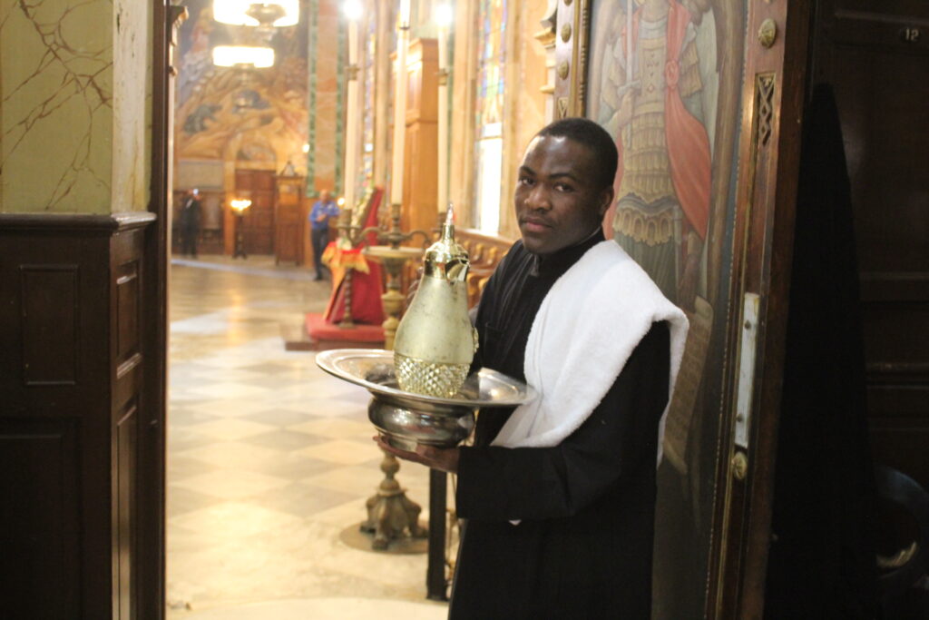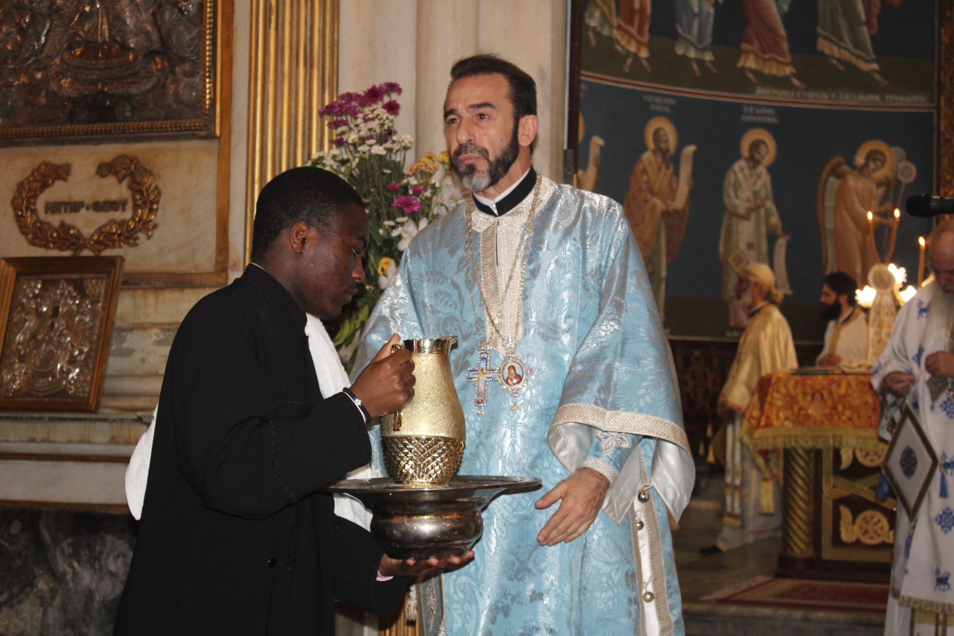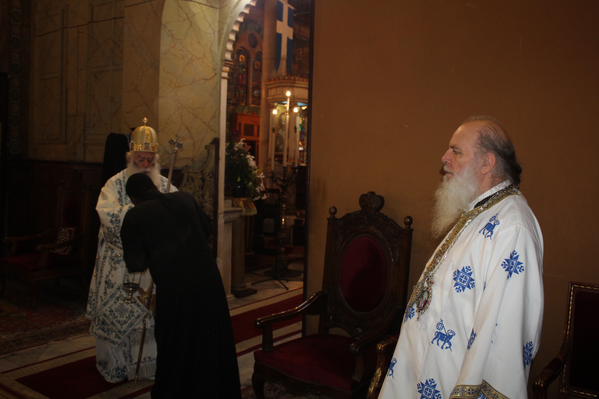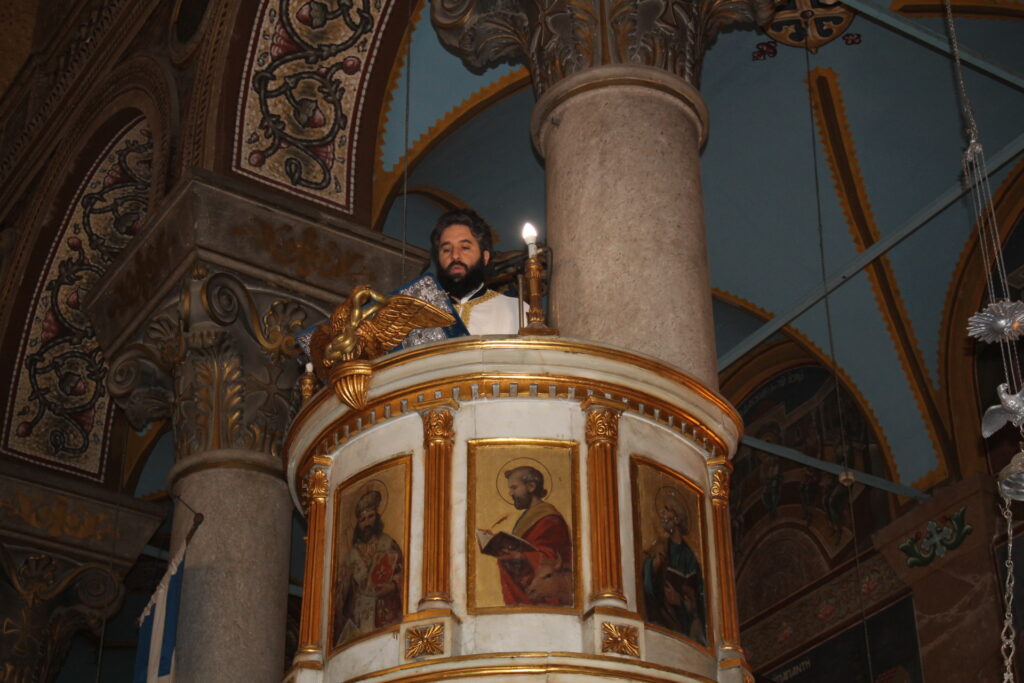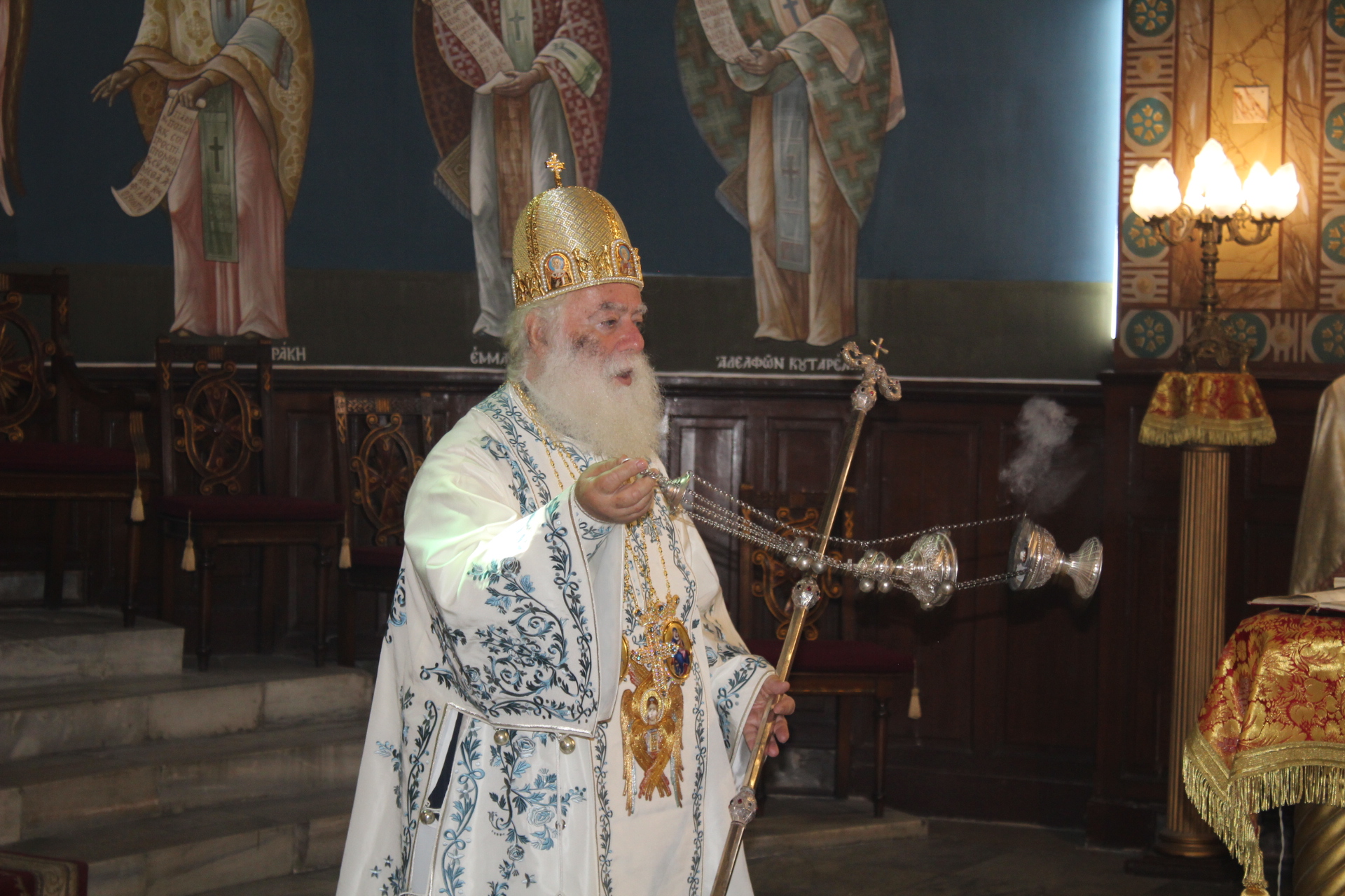 Ο Μακαριώτατος Πάπας και Πατριάρχης Αλεξανδρείας και Πάσης Αφρικής κ.κ. Θεόδωρος Β’, προεξήρχε της Θείας Λειτουργίας, με συλλειτουργούς τους Σεβασμιότατους Μητροπολίτες: Γέρων Λεοντοπόλεως κ. Γαβριήλ, Γενικό Πατριαρχικό Επίτροπο, Πτολεμαΐδος κ. Παντελεήμονα Αρχιγραμματέα της Ιεράς Συνόδου, Ταμιάθεως κ. Γερμανό Προϊστάμενο της Ιεράς Μονής του Οσίου Σάββα του Ηγιασμένου και τον Πανοσιολογιότατο Αρχιμανδρίτη κ. Δαμασκηνό Πατριαρχικό Επίτροπο, μαζί με τον Πατέρα Ανδρέα, τον αραβόφωνο ιερέα Σάμυ και μαθητές της Πατριαρχικής Σχολής Άγιος Αθανάσιος. Έψαλλαν οι ιεροψάλτες Αλέξανδρος Μπάσης και Ιωάννης Γενειατάκης.