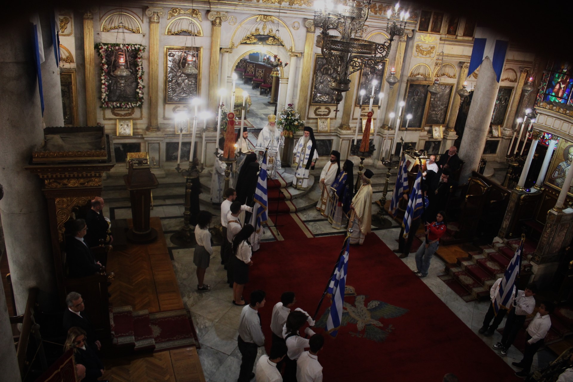 Ανήμερα της 25ης Μαρτίου, ο Καθεδρικός Ιερός Ναός του Ευαγγελισμού της Θεοτόκου, διέχεε τη «διττή» λάμψη του σε όλη την Παροικία. Η μία ήταν η πνευματική, της χριστιανικής πίστης και η άλλη η ιστορική, της εθνικής μνήμης.