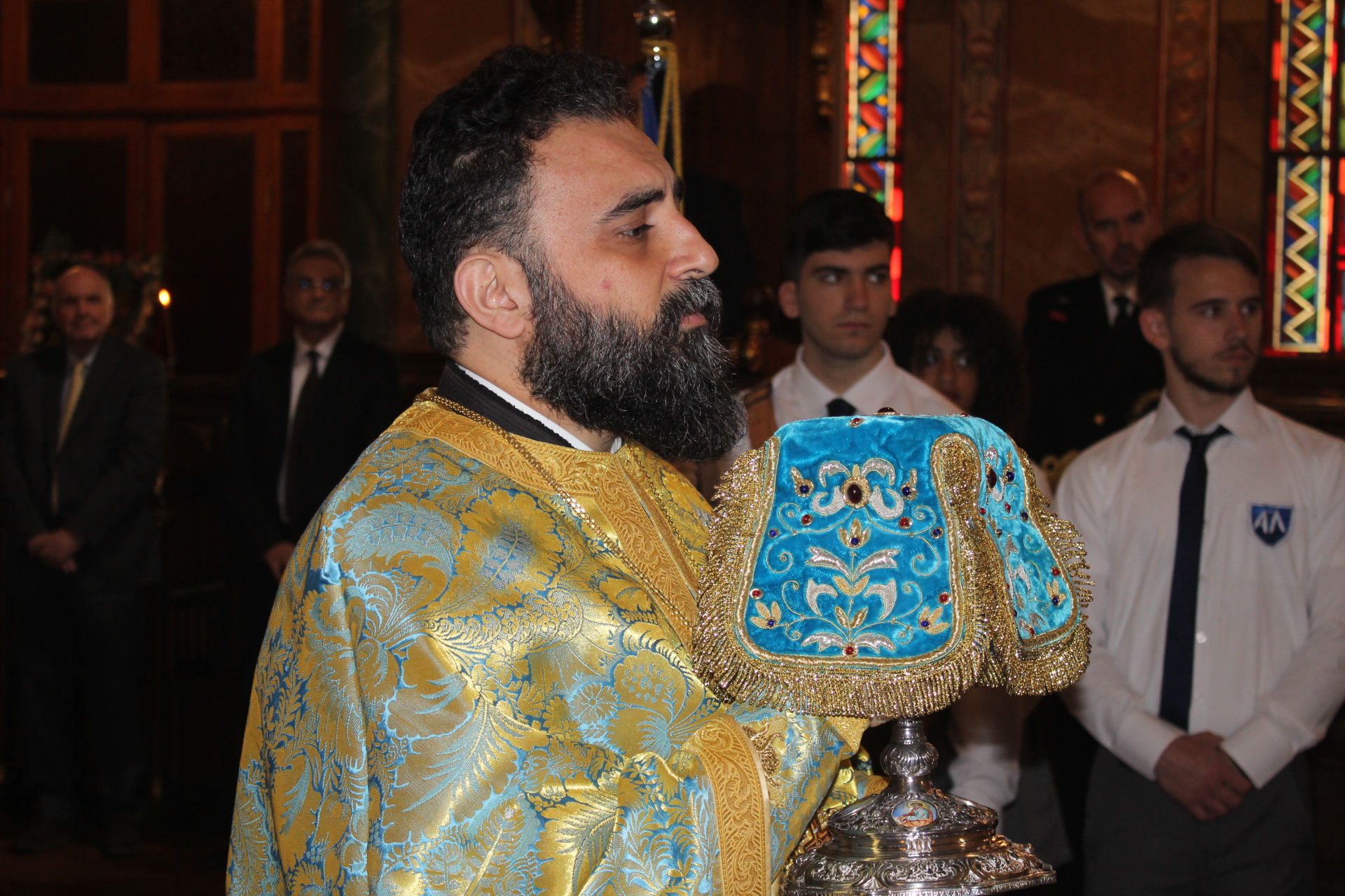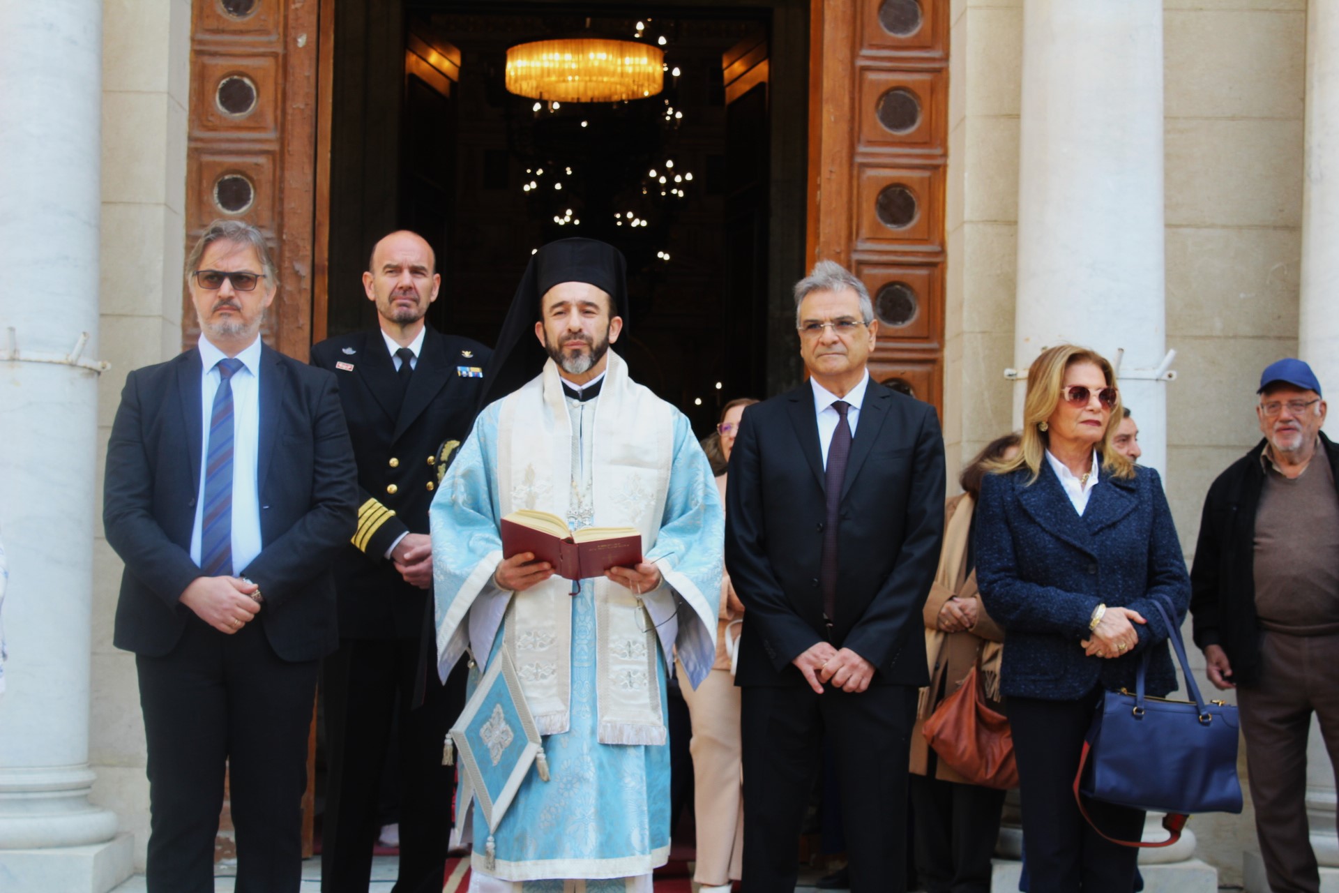 Ο Σεβασμιότατος Μητροπολίτης Πτολεμαΐδος κ. Παντελεήμονας, Αρχιγραμματέας της Ιεράς Συνόδου, προσέδωσε την αρμόζουσα ιερότητα μνήμης, με το τελετουργικό στα σκαλιά του Ναού για τους Έλληνες Ήρωες και απηύθυνε στους παρευρισκόμενους μήνυμα αγάπης και ελπίδας ενώ ευχήθηκε σε όλους χρόνια πολλά.