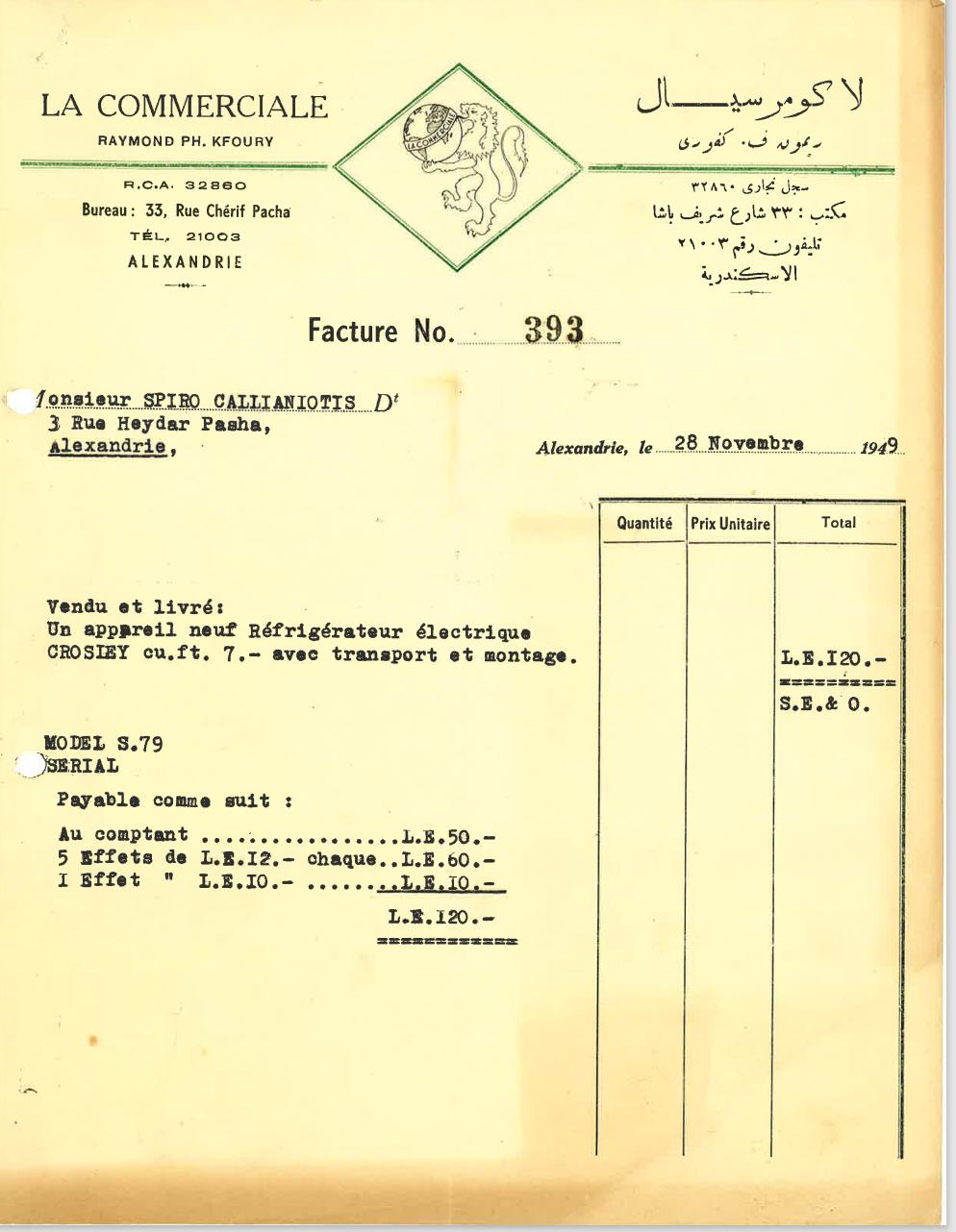 1949 Αλεξάνδρεια, απόδειξη πληρωμής ψυγείου Crosley.