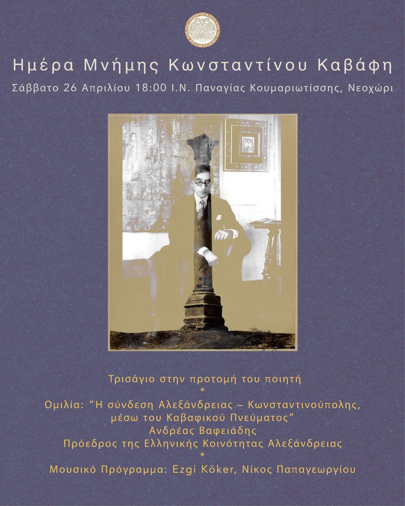 Το απόγευμα του Σαββάτου, 26 Απριλίου τ.έ., τα μέλη της Αλεξανδρινής Ομογένειας προγραμματίζεται να συμμετάσχουν στην ετήσια εκδήλωση μνήμης της Κοινότητάς μας, για τον μεγάλο Αλεξανδρινό ποιητή Κωνσταντίνο Π. Καβάφη, στην οποία ο κ. Ανδρέας Βαφειάδης, πρόεδρος του Δ.Σ. της Ε.Κ.Α., θα εκφωνήσει ομιλία με τίτλο “Η σύνδεση Αλεξάνδρειας-Κωνσταντινούπολης μέσω του καβαφικού πνεύματος”.