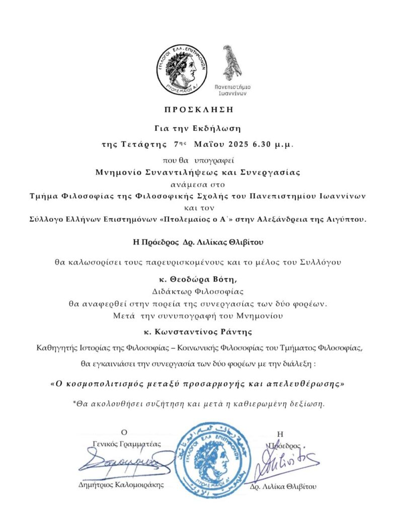 Μια εξαιρετική και απολύτως εποικοδομητική συνεργασία μέσω ενός Μνημονίου, πρόκειται να λάβει χώρα στον «Πτολεμαίο Α΄» την 7η Μαΐου 2025 και ώρα 06:30, όπου εκεί ο ομώνυμος Σύλλογος Ελλήνων Επιστημόνων, θα υπογράψει Μνημόνιο Συναντιλήψεως και Συνεργασίας με το Τμήμα Φιλοσοφίας της Φιλοσοφικής Σχολής του Πανεπιστημίου Ιωαννίνων.