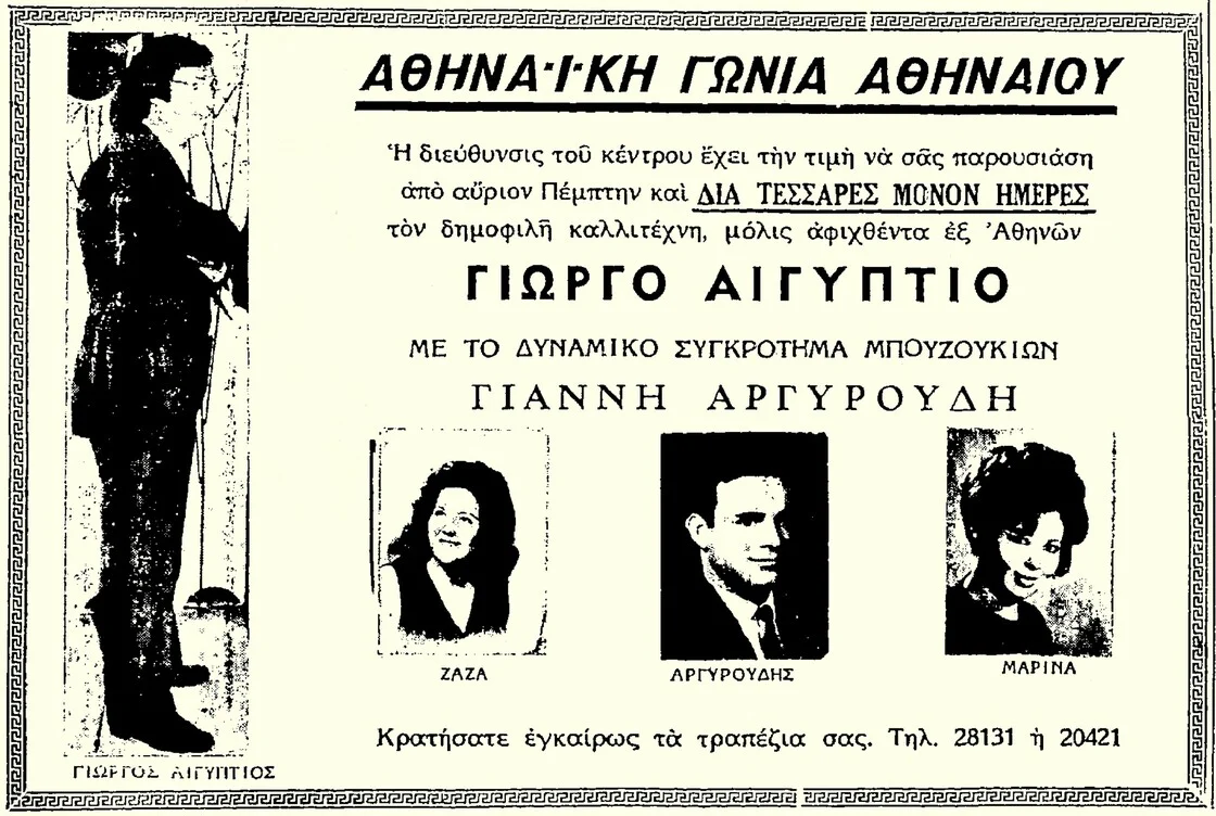 To 1966 ήταν μία πρώτη καθοριστική χρονιά για τον τραγουδιστή καθώς αρχίζει να γίνεται γνωστός στην αθηναϊκή νύχτα, ηχογραφώντας κιόλας ως Γεώργιος Αιγύπτιος το πρώτο δισκάκι του για την Philips, που περιλάμβανε δύο τραγούδια των Γιώργου Μανισαλή-Κώστα Ψυχογιού – των ανθρώπων που θα του έδιναν το νέο καλλιτεχνικό επώνυμό του, με το οποίο θα πορευόταν όλες τις επόμενες δεκαετίες. Μάλιστα, τον Νοέμβριο του ’66, ως Αιγύπτιος πια, θα βρισκόταν και πάλι στη χώρα που γεννήθηκε, εμφανιζόμενος σε κέντρα στο Κάιρο και την Αλεξάνδρεια.