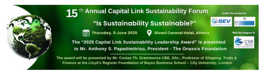Στις 5 Ιουνίου 2025, ο Σύνδεσμος μας εκπροσωπούμενος από τον Πρόεδρο κ.Κώστα Μιχαηλίδη, την Γ.Γ. Έλενα Κοσσένα καθώς και το μέλος του Διοικητικού Συμβουλίου κ. Κων/νο Πετροπουλιάδη συμμετείχαν στο 15th Annual Capital Link Sustainability Forum καθώς και στην βράβευση του κ. Αντώνη Σ. Παπαδημητρίου Προέδρου του Ιδρύματός Ωνάση.