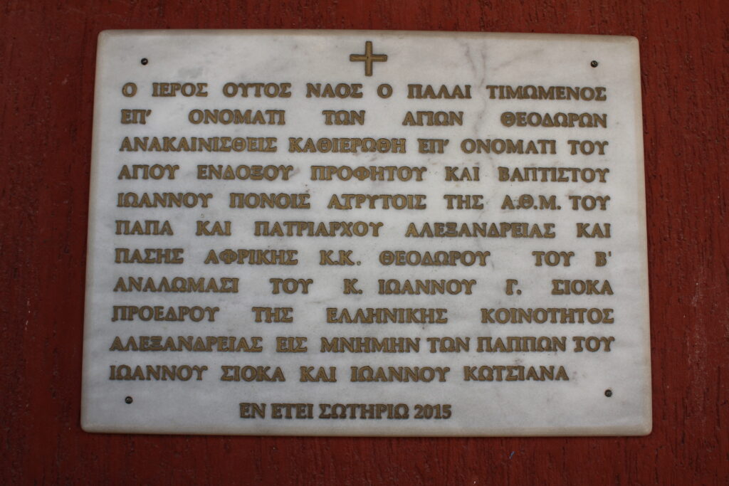 «Το σημερινό κήρυγμα αδελφοί και αδελφές, είναι για την θεολογία του Μαρτυρίου και πιο συγκεκριμένα θα αναφερθούμε στο παράδειγμα του  Αγίου Ιωάννου του Προδρόμου, μιας και σήμερα η Εκκλησίας μας εορτάζει, εδώ στον ιστορικό αυτό Ναό που στεγάζεται, στο πάλαι ποτέ περιώνυμον Κοτσίκειον Νοσοκομείον και πλέον είναι αφιερωμένος στον Άγιο μας, το τεράστιο εκείνο συγκρότημα που δώρισε η οικογένεια Κότσικα και στέγασε το ελληνικό νοσοκομείο Αλεξανδρείας την δεκαετία του 1930. Είναι γραμμένο στις σελίδες της ελληνικής ιστορίας η τεράστια συνεισφορά του για την ελληνική κυβέρνηση και τον ελληνικό στρατό κατά την περίοδο της γερμανικής κατοχής. Πλέον μας δίδεται η άδεια από το αιγυπτιακό κράτος να λειτουργείται ο ναός και έτσι αναπέμποντας την δέηση μας προς τον Κύριο και εορτάζοντας τον Άγιο Ιωάννη τον Πρόδρομο, αγκαλιάζουν και ευφραίνονται οι ψυχές των κεκοιμημένων που πέρασαν από εδώ».
