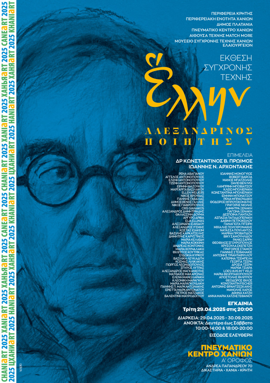 Στα Χανιά της Κρήτης λοιπόν, ο Καβάφης τιμάται μέσω της εσπερίδας «Μνήμη Καβάφη V» και της έκθεσης σύγχρονης τέχνης «Έλλην Αλεξανδρινός Ποιητής V», στο Πνευματικό Κέντρο Χανίων και θα διαρκέσει μέχρι την 30.9.2025, με ελεύθερη είσοδο.