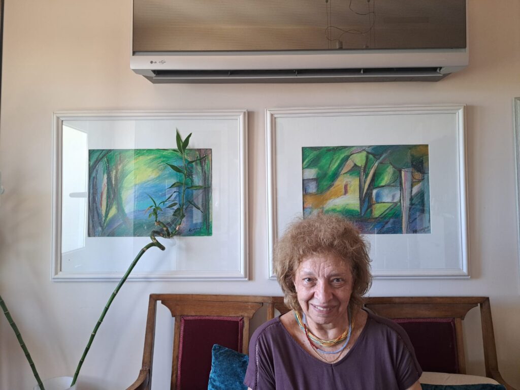 Η Μαρία Κουναλάκη μπροστά σε δυο έργα της