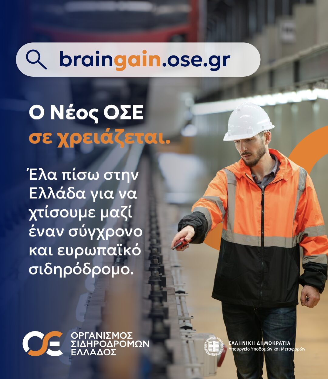 | Ο Νέος ΟΣΕ σε χρειάζεται. Ο ΟΣΕ και το Υπουργείο Υποδομών και Μεταφορών απευθύνει κάλεσμα στους Έλληνες επαγγελματίες στον σιδηρόδρομο, τις μεταφορές ή τα δημόσια έργα του εξωτερικού να επιστρέψουν και να συμβάλουν στη δημιουργία ενός σύγχρονου και ευρωπαϊκού σιδηρόδρομου. Μάθε περισσότερα στο braingain.ose.gr |