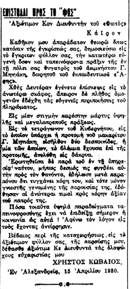 Επιστολή δημοσιευμένη στο Φως του Καϊρου στις 16 Απριλίου 1930. Το μοναδικό τεκμήριο περί προτομής του Μηνιάκη επί του Άρεως.