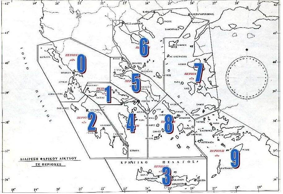 Το Ελληνικό Φαρικό δίκτυο έχει διαιρεθεί σε 10 περιοχές που χαρακτηρίζονται με τους αριθμούς από 0 μέχρι 9, όπως φαίνεται στον χάρτη. Σκοπός αυτής της διαίρεσης είναι ο άμεσος προσδιορισμός της γενικότερης γεωγραφικής θέσης στην οποία βρίσκεται ένας πυρσός, όταν αυτός αναφέρεται με τον Εθνικό Αριθμό του ή συντομογραφικά ΑΕΦ του πυρσού.