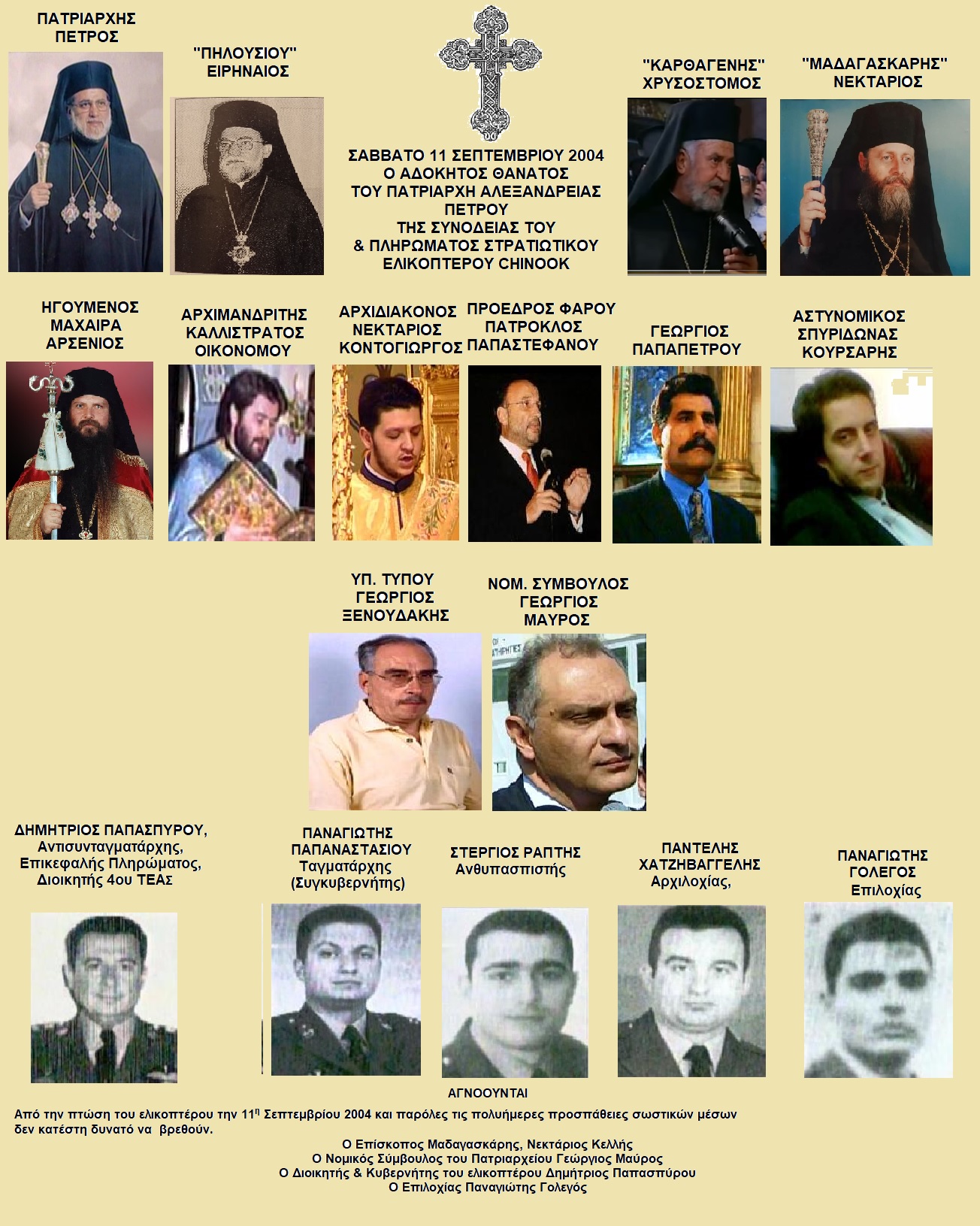 Ήταν 11 Σεπτεμβρίου του 2004 όταν το στρατιωτικό ελικόπτερο τύπου «ΣΙΝΟΥΚ», που μετέφερε τον Πατριάρχη Αλεξανδρείας Πέτρο στο Άγιον Όρος και τη συνοδεία του, κατέπεσε στη θάλασσα, ανοικτά του Άθω, λίγο πριν προσγειωθεί, παρασύροντας στον θάνατο τους επιβάτες του. Συνολικά 17 νεκροί, ανάμεσά τους και ο Αλεξανδρινός Προκαθήμενος κυρός Πέτρος.
