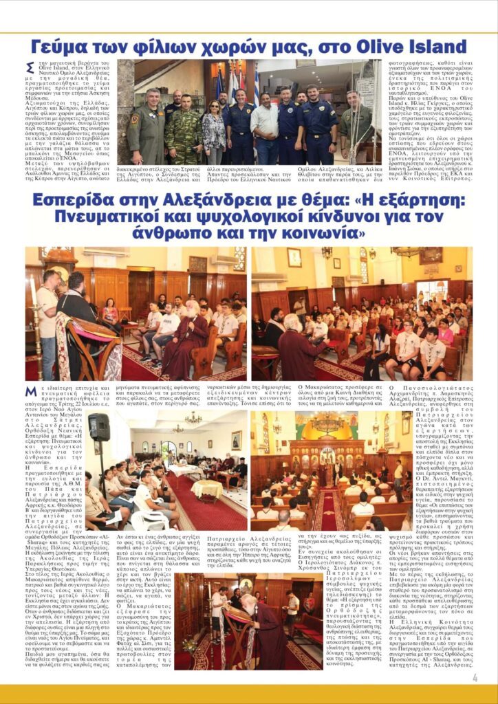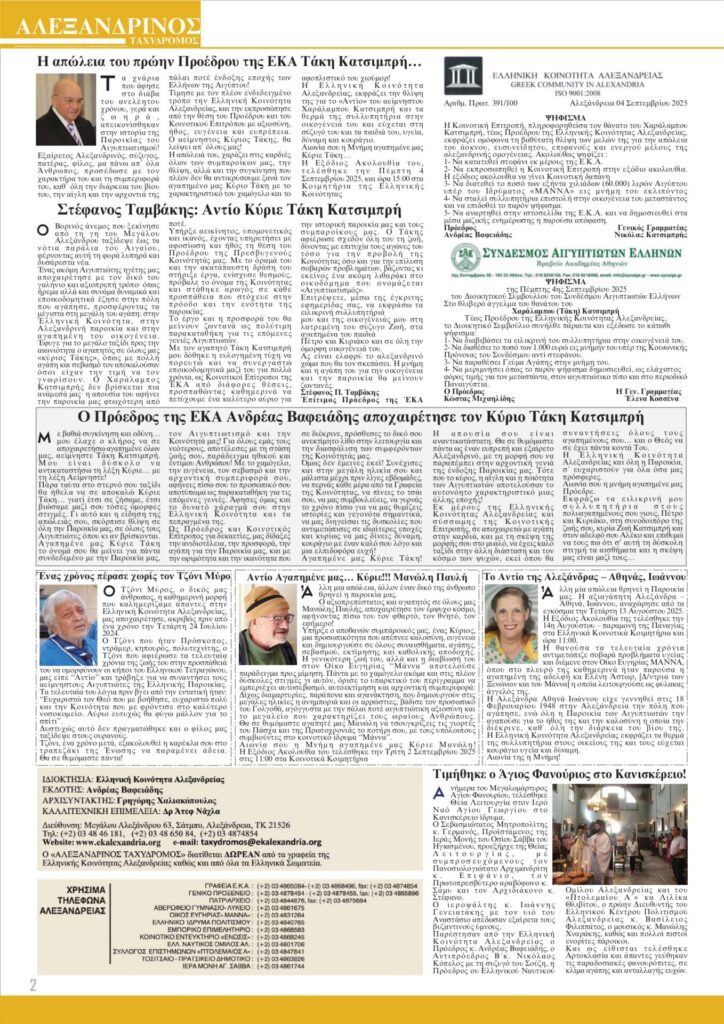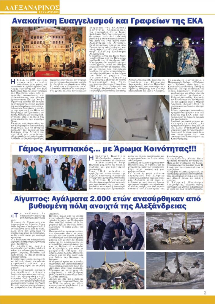 Κυκλοφόρησε ο “Αλεξανδρινός Ταχυδρόμος” σε τρίμηνη έκδοση Ιουλίου – Αυγούστου – Σεπτεμβρίου 2025. Στο εξής επανέρχεται η μηνιαία έκδοση, η οποία ένεκα καλοκαιριού, ως είθισται, εκδόθηκε με τους θερινούς μήνες μαζί, η δε ιστοσελίδα μας πρόβαλε σε καθημερινή βάση όλη την ειδησεογραφία που αφορά σε Ελλάδα, Αίγυπτο και Κύπρο. Καλό μήνα!