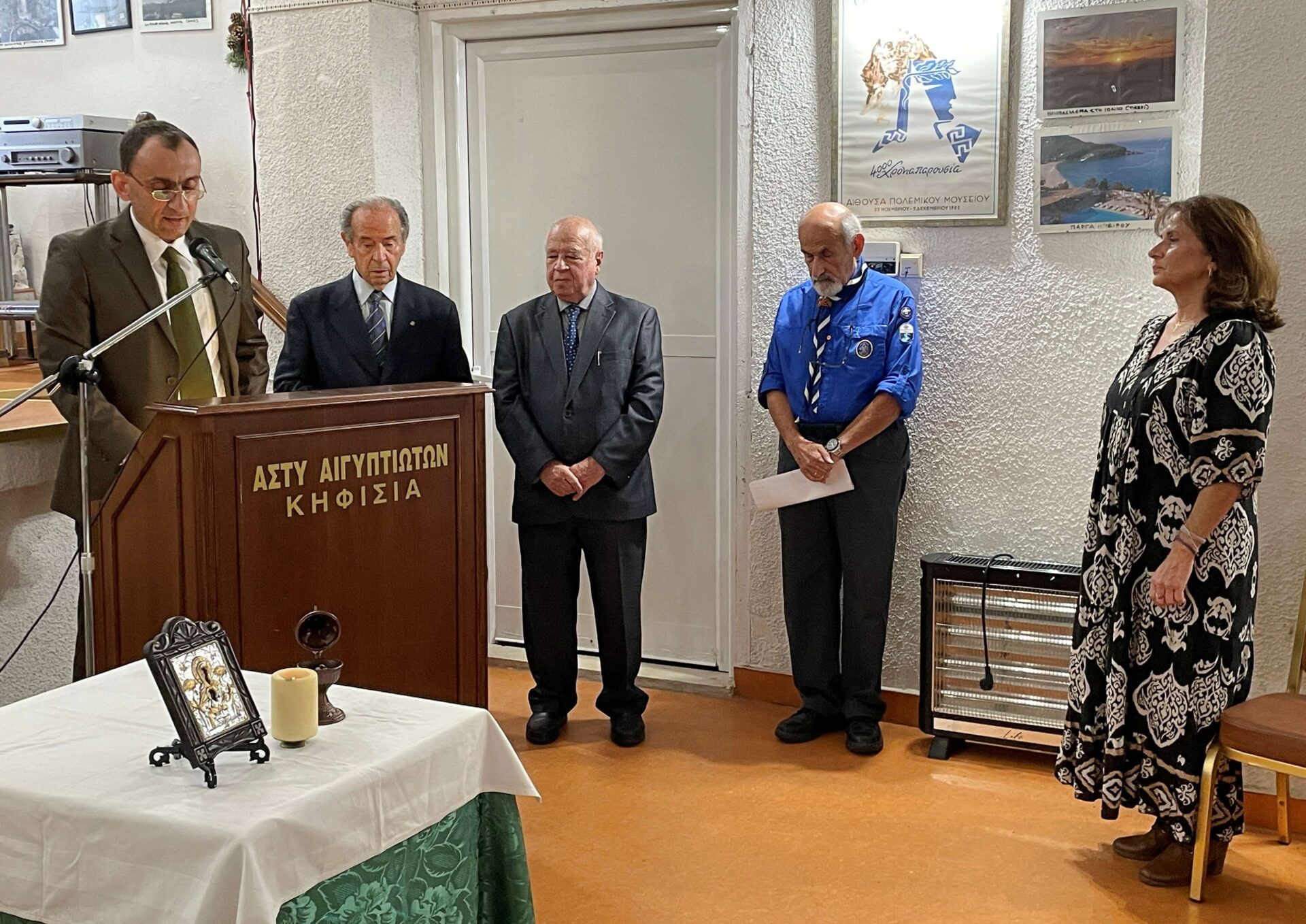 Ακολούθησε η επιμνημόσυνη δέηση από τον εκπρόσωπο της Ιεράς Μητροπόλεως Κηφισιάς, Πρωτοπρεσβύτερο π. Χαράλαμπο, και στη συνέχεια ο Πρόεδρος του Συνδέσμου Αιγυπτιωτών Ελλήνων, κ. Κώστας Μιχαηλίδης, παρέδωσε τον λόγο στον κ. Χρήστο Ευαγγέλου, Αρχηγό Παλαιών Προσκόπων Περιφερειακών Εφορειών Αλεξανδρείας & Καΐρου, ο οποίος αναφέρθηκε με συγκίνηση στη σημαντική συμβολή των Αιγυπτιωτών Προσκόπων κατά τη διάρκεια του πολέμου.