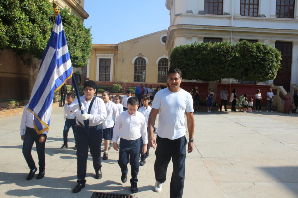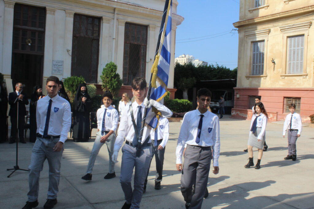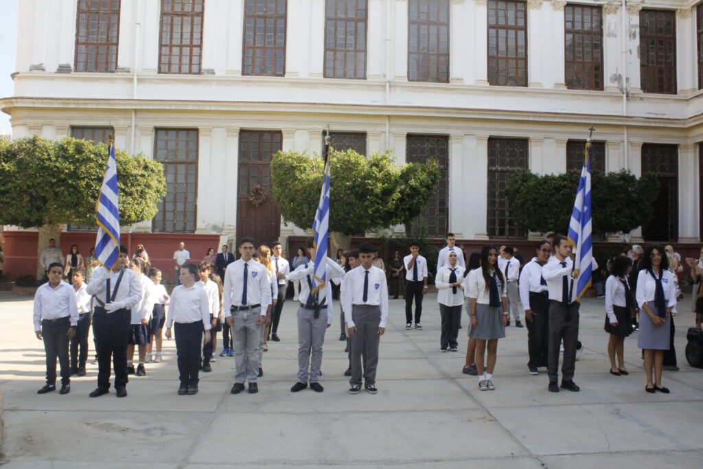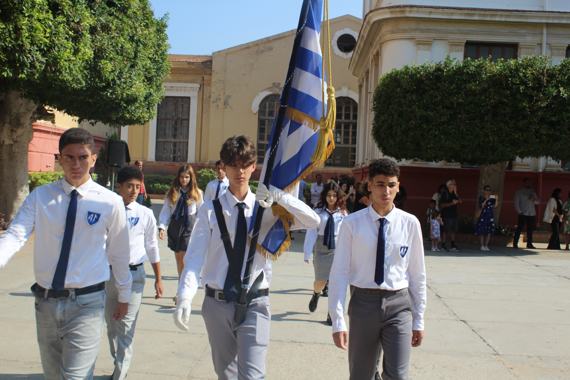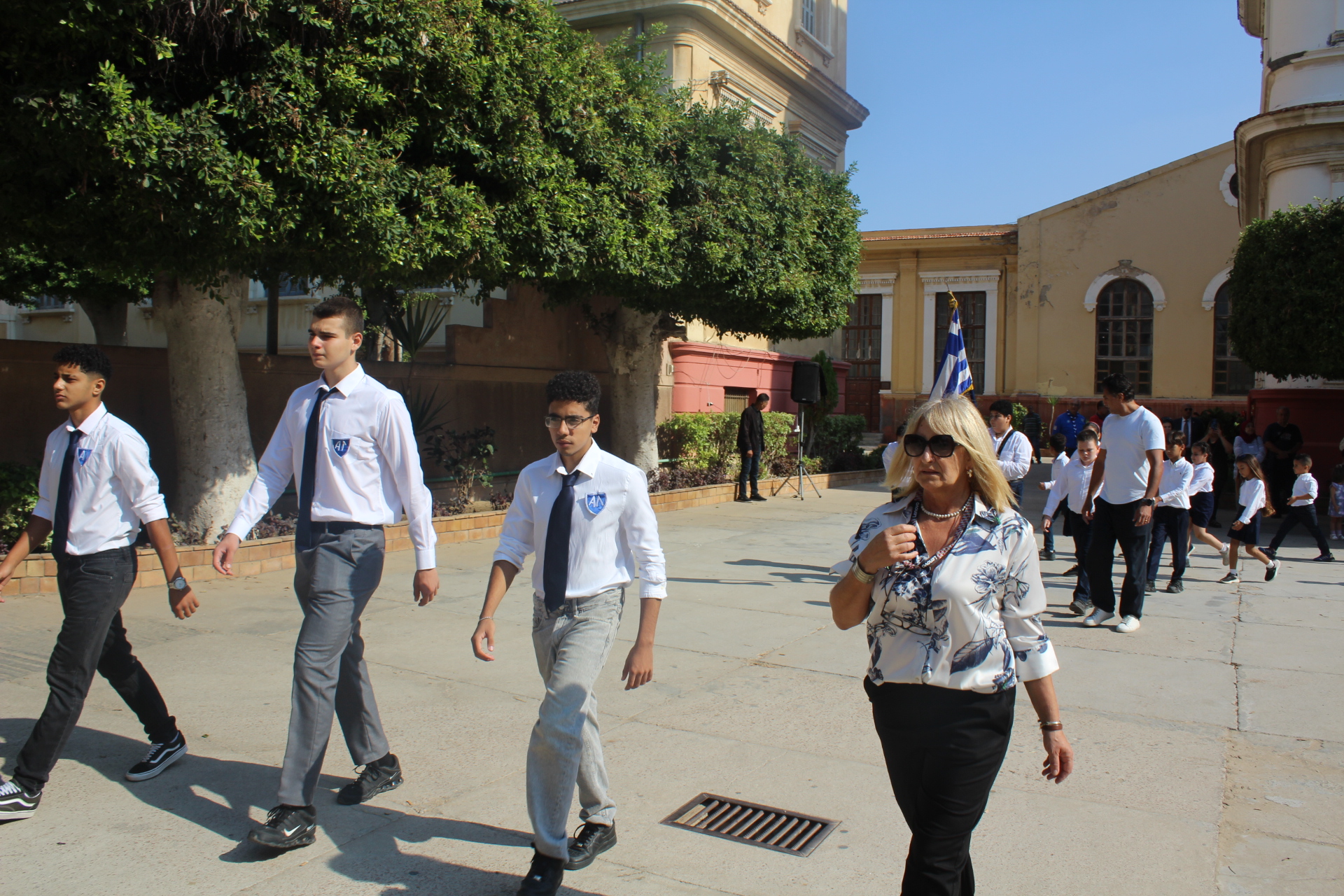 Στην Επέτειο της 28ης Οκτωβρίου παρέστησαν οι κάτωθι: ο Σεβασμιότατος Μητροπολίτης κ. Γερμανός Προϊστάμενος της Ιεράς Μονής του Οσίου Σάββα του Ηγιασμένου, μετά των Πανοσιολογιότατων Αρχιμανδριτών κυρίων Αθανασίου, Ιωακείμ και Επιφανίου, ο Γενικός Πρόξενος της Ελλάδας στην Αλεξάνδρεια κ. Ιωάννης Πυργάκης, μετά της συζύγου του κας Κατερίνας Γιδαράκου, ο Σύνδεσμος της Ελλάδας στην Αλεξάνδρεια Πλοίαρχος του Πολεμικού Ναυτικού κ. Χρυσόστομος Ράγκος μετά της συζύγου του κας Έλλης Ράγκου, ο Πρόεδρος της Ελληνικής Κοινότητας Αλεξανδρείας κ. Ανδρέας Βαφειάδης, ο Γενικός Γραμματέας κ. Νικόλαος Κατσιμπρής, ο Αναπληρωτής Γενικός Γραμματέας κ. Δημήτριος Κάβουρας, ο Κοινοτικός Επίτροπος κ. Βασίλειος Ζουές, η Πρόεδρος του ΕΝΟΑ και του Πτολεμαίου Α΄ κα Λιλίκα Θλιβίτου, η Πρόεδρος του Λυκείου Ελληνίδων Αλεξανδρείας κα Αλίκη Αντωνίου, η Διευθύντρια του Γυμνασίου Λυκείου κα Αφροδίτη Πεβερέτου, η Διευθύντρια του Τοσιτσαίου Πρατσίκειου Δημοτικού κα Αδαμαντία Νικολακοπούλου, η Διευθύντρια των Κοινοτικών Ξενώνων και του Ιδρύματος «Μάννα» κα Ελένη Άστωρ, ο Dr αρχαιολόγος κ. Κυριάκος Σαββόπουλος, ο μουσικός κ. Μανώλης Χναράκης, όλοι οι εκπαιδευτικοί, οι εργαζόμενοι στην Κοινότητα, γονείς συγγενείς και φίλοι των μαθητών που παρέλασαν.