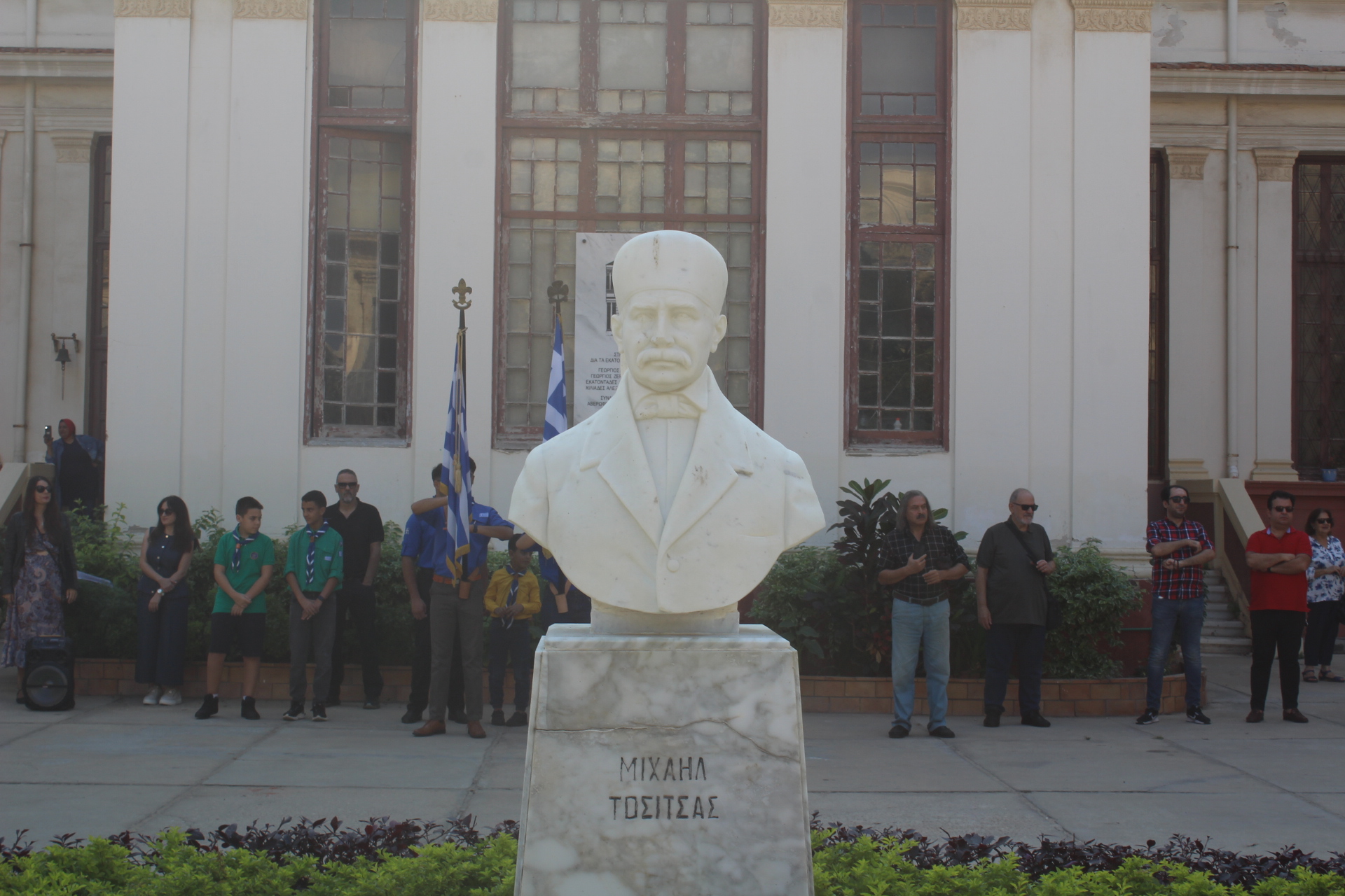 Στη συνέχεια άπαντες εξήλθαν του Ναού της Αγίας Αικατερίνης και ακολούθησε η παρέλαση στον αύλιο χώρο του Αβερωφείου Γυμνασίου – Λυκείου στο σημείο ακριβώς που βρίσκεται η προτομή του Μεγάλου Ευεργέτη Μιχαήλ Τοσίτσα. Με καμάρι και υπερηφάνεια παρέλασαν οι μαθήτριες και οι μαθητές του Τοσιτσαίου και του Αβερωφείου, ενώ οι παριστάμενοι χειροκροτούσαν τα νέα παιδιά και τους εφήβους.