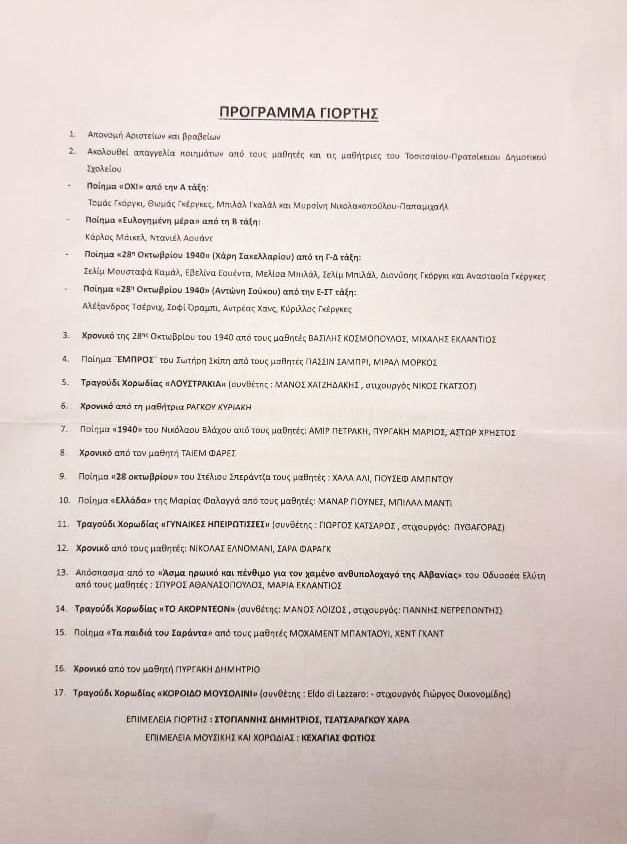 Τα παιδιά προσέφεραν εξαιρετικό θέαμα με ποίηση, στίχους και τραγούδια που άπτονταν του Έπους του ’40, υποχρεώνοντας το ακροατήριο να τα καταχειροκροτήσει για την ικανότητα να τραγουδήσουν γνωστά και ποιοτικά άσματα με αρμονία. Επίσης αναγνώστηκαν από την εκπαιδευτικό κα Βίβιαν Δεληγιάννη οι έπαινοι και οι βραβεύσεις των μαθητών της προηγούμενης χρονιάς, παραδόθηκαν από την κα Πεβερέτου και η όλη εκδήλωση αποτέλεσε παρελθόν. Έθεσε όμως γερά θεμέλια, έτσι ώστε να συνεχίζεται και τα επόμενα χρόνια με την ίδια ζέση και υπερηφάνεια, η απόδοση των τιμών για όλους εκείνους που θυσιάστηκαν για την απελευθέρωση της Ελλάδας.