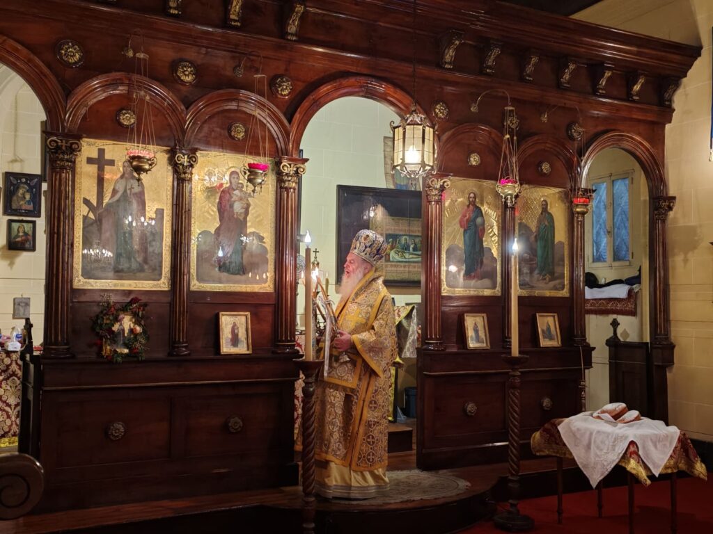 Τη Θεία Λειτουργία λάμπρυνε με την παρουσία του ο Θεοφιλέστατος Μητροπολίτης Ταμιάθεως κ. Γερμανός – Προϊστάμενος της Ιεράς Μονής του Οσίου Σάββα του Ηγιασμένου, με συμπροσευχόμενους τον Σεβασμιότατο Μητροπολίτη Γέρων Λεοντοπόλεως κ. Γαβριήλ, Γενικό Πατριαρχικό Επίτροπο και τον Πανοσιολογιότατο Αρχιμανδρίτη κ. Επιφάνιο. Απέδωσαν τους βυζαντινούς ύμνους οι ιεροψάλτες κ. Ιωάννης Γενειατάκης και κ. Αλέξανδρος Μπάσης.