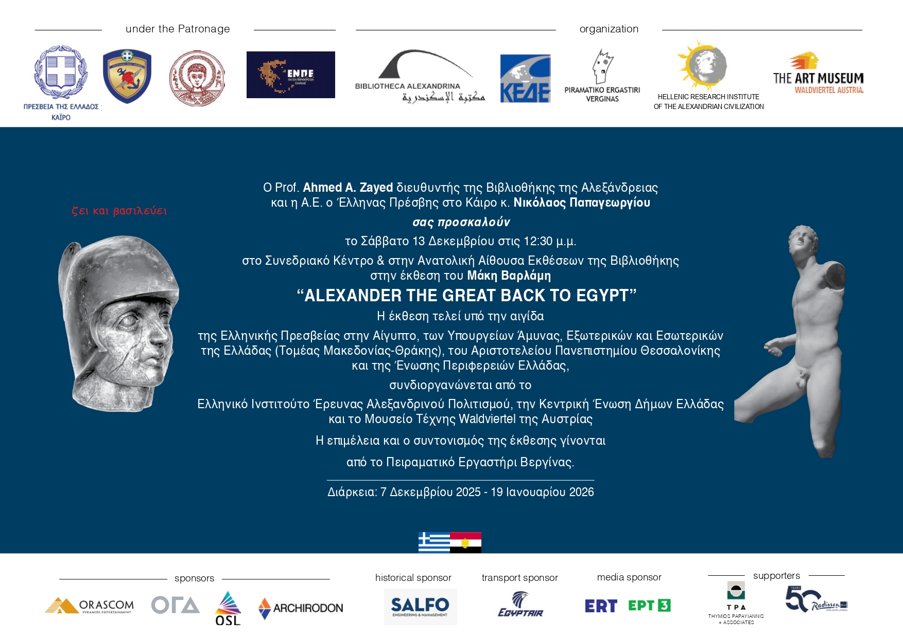 Η έκθεση τελεί υπό την αιγίδα της Ελληνικής Πρεσβείας στο Κάιρο, των υπουργείων Άμυνας, Εξωτερικών και Εσωτερικών, όπως επίσης του ΑΠΘ και της ΕΝΠΕ. Είναι συνδιοργάνωση της BIBLIOTHECA ALEXANDRINA, του ΠΕΙΡΑΜΑΤΙΚΟΥ ΕΡΓΑΣΤΗΡΙΟΥ ΒΕΡΓΙΝΑΣ, της ΚΕΔΕ, του Ελληνικού Κέντρου Έρευνας του Αλεξανδρινού Πολιτισμού στην Αλεξάνδρεια και του Μουσείου Τέχνης της Αυστρίας.