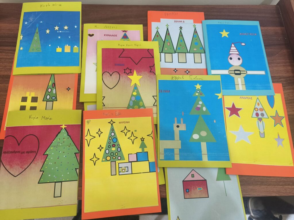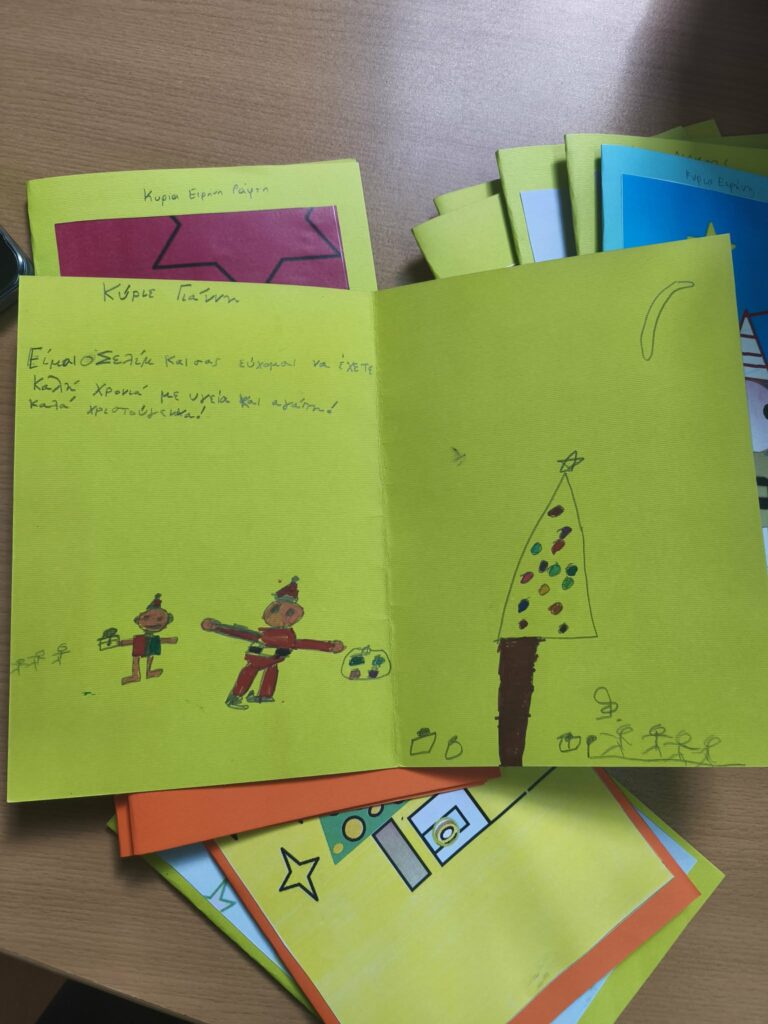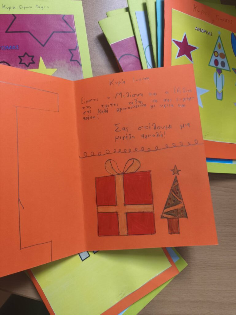 Με εμπνεύστριες τις εκπαιδευτικούς, κες: Αμάντα Νικολακοπούλου διευθύντρια του ανωτέρω Σχολείου, Βούλα Μανδραγού και Χαρά Τσατσαράγκου προέτρεψαν τους μαθητές να ζωγραφίσουν κάρτες εορταστικές και να τις προσφέρουν στους ηλικιωμένους συμπαροίκους μας των οποίων η τύχη τους οδήγησε στον Οίκο Ευγηρίας «Μάννα».