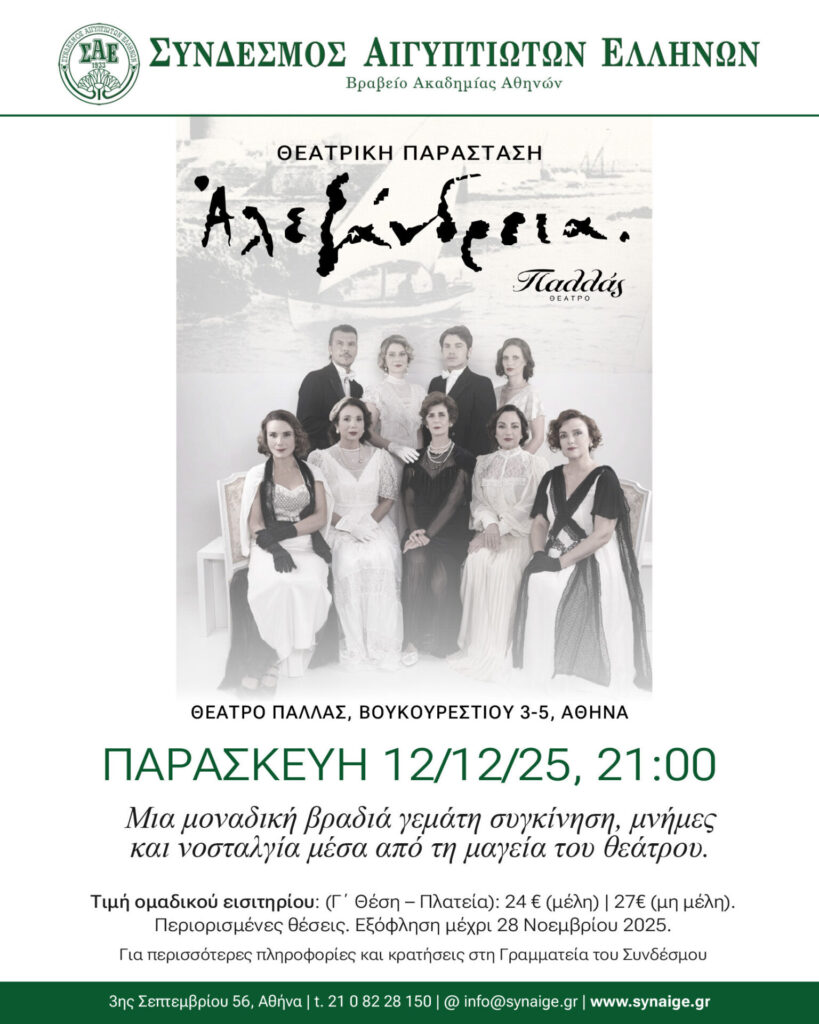 Μια βραδιά πλημμυρισμένη από συγκίνηση, μνήμες και βαθιά νοσταλγία έζησαν τα μέλη και οι φίλοι του Συνδέσμου Αιγυπτιωτών Ελλήνων την Παρασκευή 12 Δεκεμβρίου 2025, στο κατάμεστο Θέατρο Παλλάς, παρακολουθώντας τη θεατρική παράσταση «Αλεξάνδρεια».