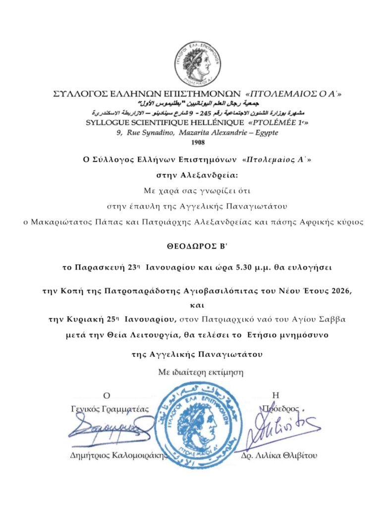 Ο Σύλλογος Ελλήνων Επιστημόνων Πτολεμαίος Α΄ την Παρασκευή 23 Ιανουαρίου 2026 και ώρα 5:30, θα κόψει την Αγιοβασιλόπιτά του με την ευλογία του Πατριάρχη Αλεξανδρείας!