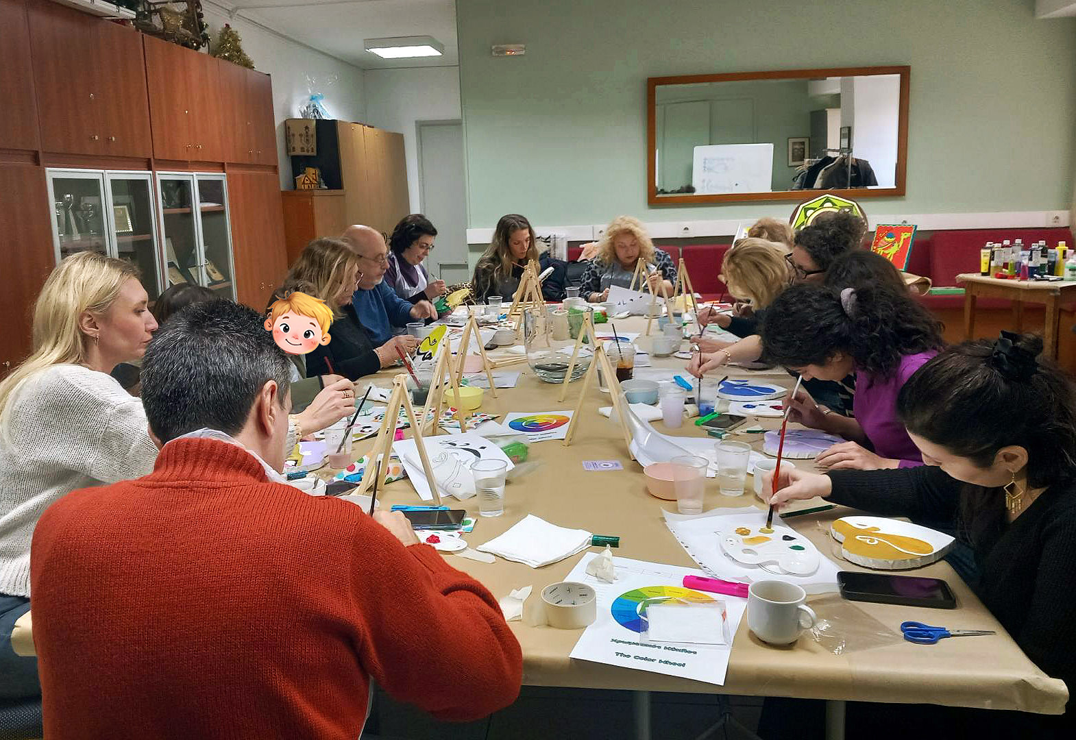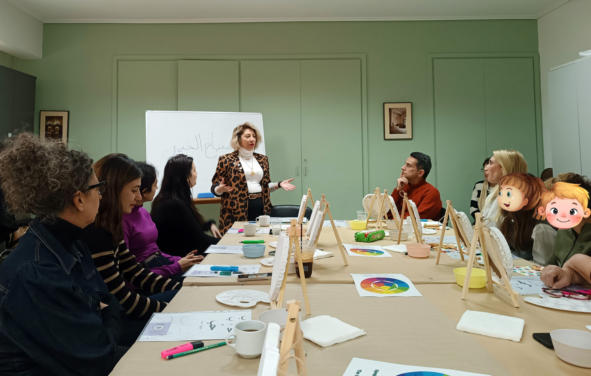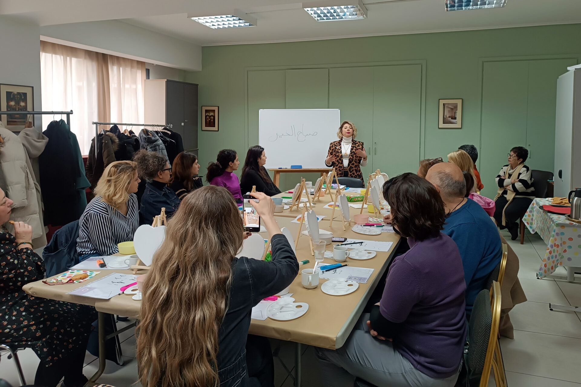 Το εργαστήριο πραγματοποιήθηκε σε ζεστό και φιλικό κλίμα, γεμάτο δημιουργική διάθεση, ανταλλαγή ιδεών και χρωμάτων, αλλά και στιγμές χαλάρωσης με καφέ και κεράσματα. Μετά την ολοκλήρωση, οι συμμετέχοντες παρέμειναν στον χώρο, απολαμβάνοντας αραβικές γεύσεις στο εστιατόριο του Συνδέσμου και μοιράζοντας μεταξύ τους την εμπειρία τους.