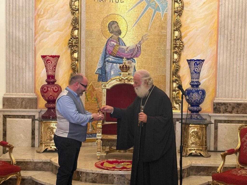 Εκ μέρους του σχολείου, ο κ. Γαλανόπουλος ευχαρίστησε θερμά τον Μακαριώτατο για τη θερμή και πατρική υποδοχή, καθώς και για την αγάπη με την οποία πάντοτε περιβάλλει τη μαθητιώσα νεολαία. Συγκινημένος, αναφέρθηκε στα χρόνια της υπηρεσίας του στην Αλεξάνδρεια, αναγνωρίζοντας ότι το Πατριαρχείο υπήρξε για τον ίδιο όχι απλώς τόπος διακονίας, αλλά οικογένεια, σημείο αναφοράς και πνευματικό στήριγμα ζωής. Ως ένδειξη ευγνωμοσύνης και τιμής, προσέφερε εκ μέρους του Πειραματικού Μουσικού Γυμνασίου Παλλήνης τιμητική διάκριση του σχολείου προς τον Μακαριώτατο