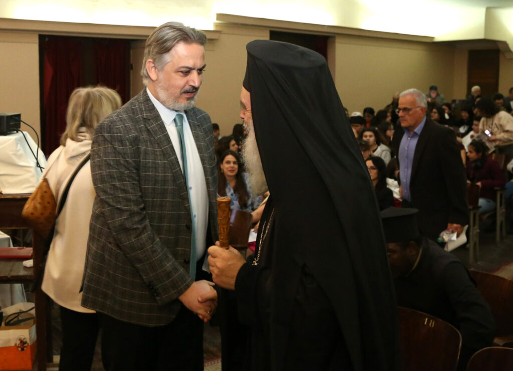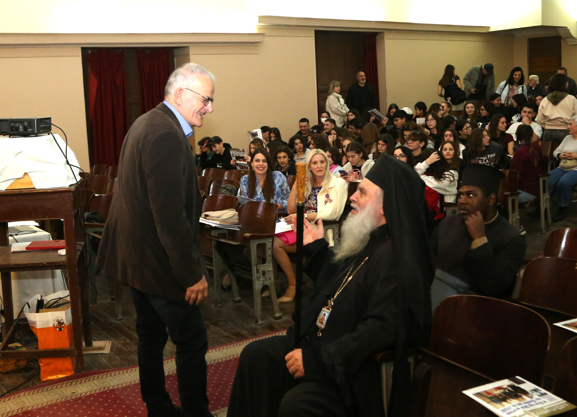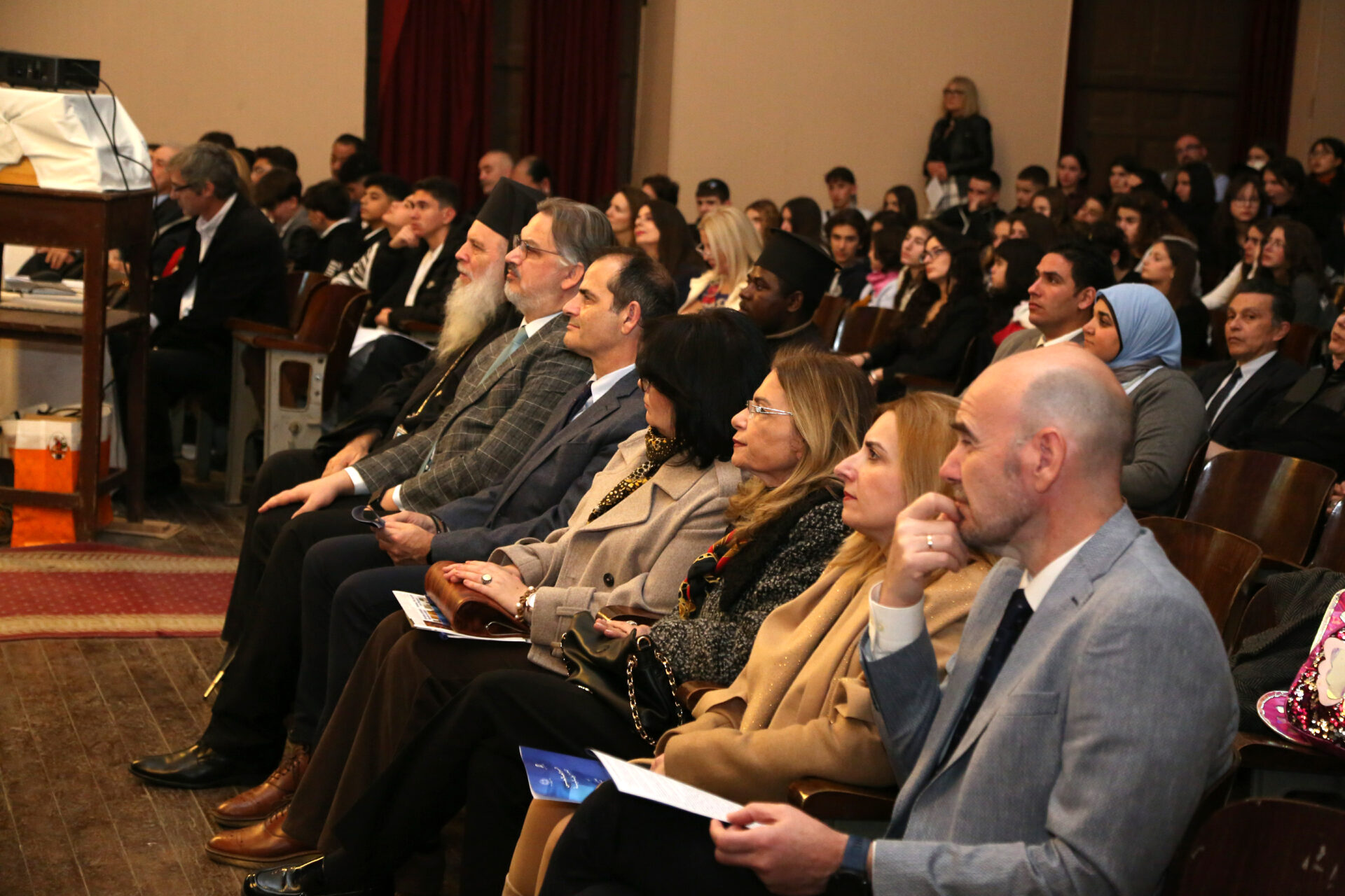 Με την είσοδο εντός της αιθούσης του Πανιερώτατου κ. Γερμανού Προϊστάμενου της Ιεράς Μονής του Οσίου Σάββα του Ηγιασμένου και πνευματικού οδηγού της Πατριαρχικής Σχολής άρχισε το τελετουργικό της εκδήλωσης.