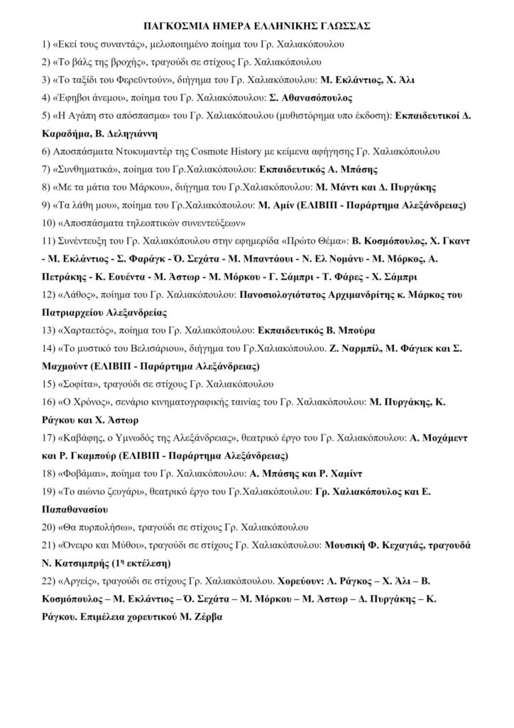 Το Σάββατο 7 Φεβρουαρίου 2026 στην αίθουσα Ιουλία Σαλβάγου, τιμήθηκε με εκδήλωση για την Παγκόσμια Ημέρα της Ελληνικής Γλώσσας. Είναι η τρίτη φορά που πραγματοποιείται στον ίδιο χώρο εντός Ελληνικού Τετραγώνου, υπό την αιγίδα του Γενικού Προξενείου Ελλάδας στην Αλεξάνδρεια και της Ελληνικής Κοινότητας Αλεξανδρείας, με συνδιοργανωτές την Πατριαρχική Σχολή «Άγιος Αθανάσιος», το Ελληνικό Ίδρυμα Βιβλίου και Πολιτισμού Αλεξανδρείας και το Αβερώφειο Γυμνάσιο Λύκειο. Όπως είχε προαναγγελθεί, κατά τη συγκεκριμένη ημέρα παρουσιάστηκε το λογοτεχνικό έργο του συγγραφέα ποιητή, ερευνητή και αρχισυντάκτη του Αλεξανδρινού Ταχυδρόμου Γρηγόρη Χαλιακόπουλου.