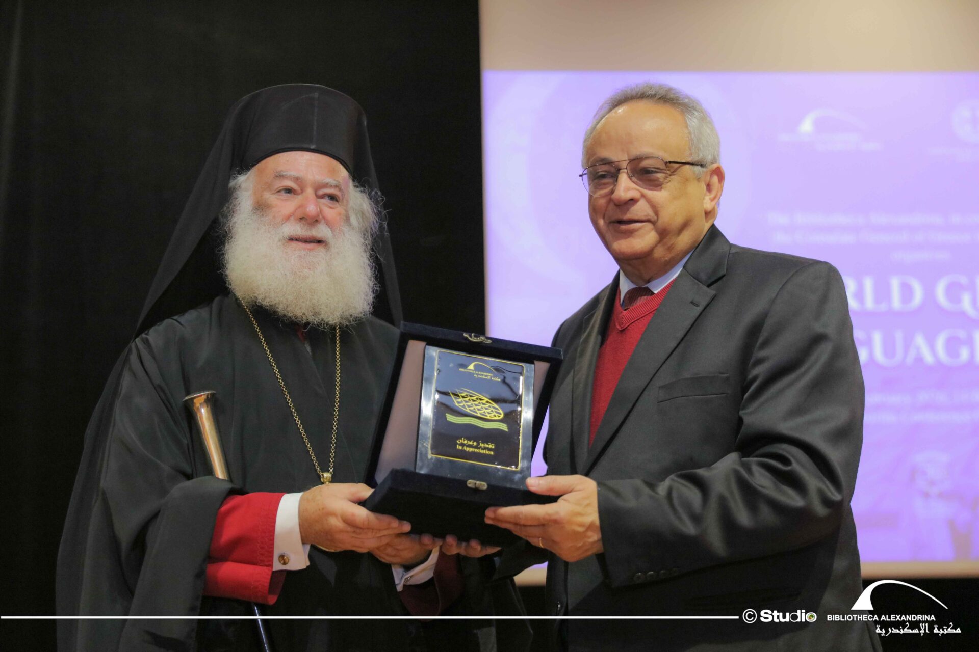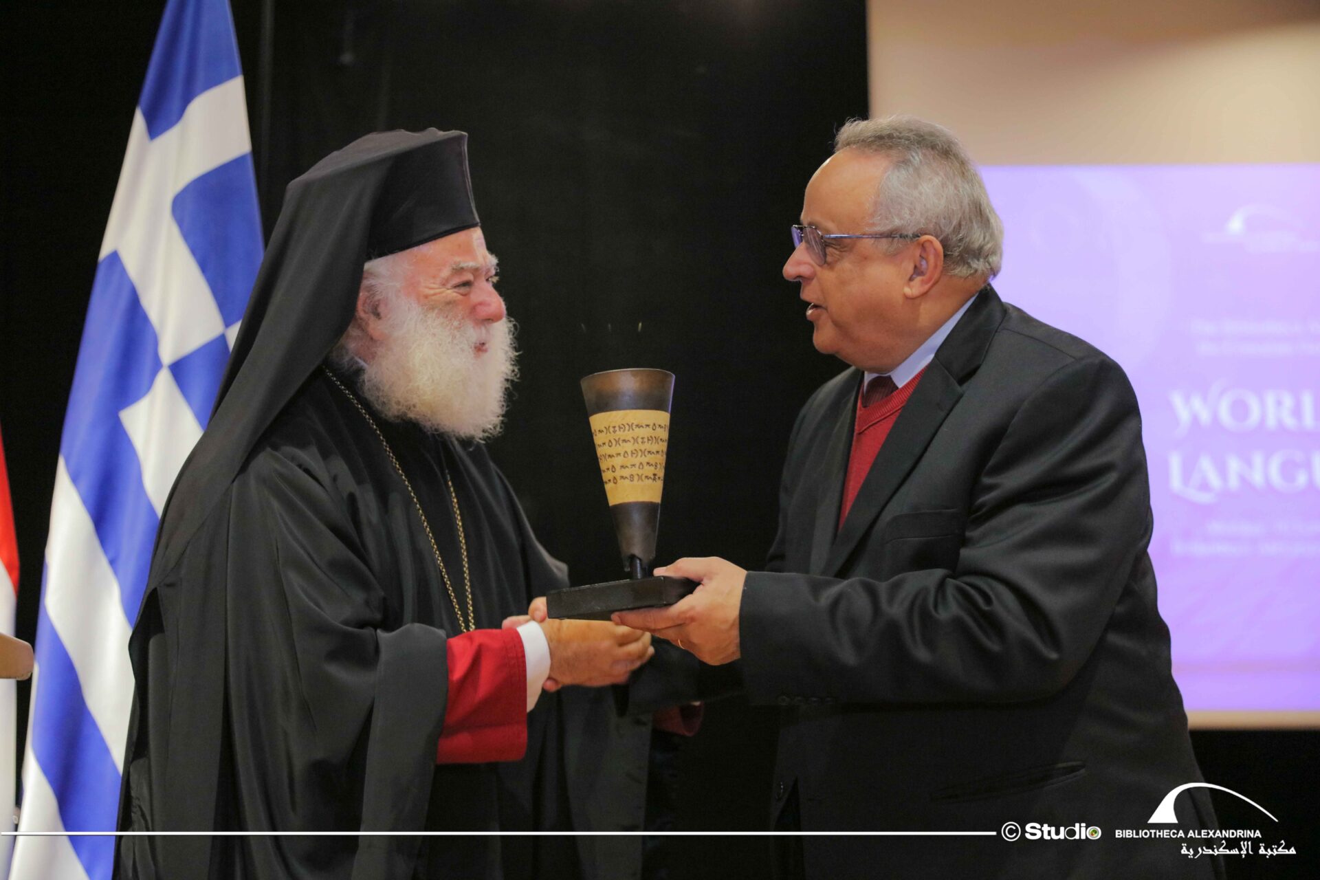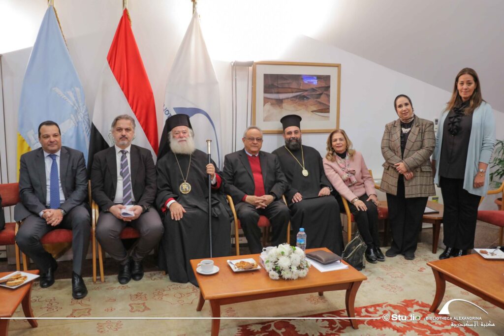 Να καταγραφεί ακόμη, η όμορφη στιγμή της ανταλλαγής αναμνηστικών μεταξύ του Μακαριωτάτου και του Διευθυντή της Βιβλιοθήκης καθηγητή Dr Ahmed Zayed. Ο Μακαριώτατος προσέφερε στη Βιβλιοθήκη της Αλεξάνδρειας ένα καλαίσθητο αντίγραφο αρχαίου αγγείου με ελληνική επιγραφή, συμβολίζοντας τη διαχρονική πορεία και τη ζωντανή παρουσία της ελληνικής γλώσσας από την αρχαιότητα έως σήμερα. Εκ μέρους της Βιβλιοθήκης της Αλεξάνδρειας, ο Διευθυντής της Dr Ahmed Zayed προσέφερε στον Μακαριώτατο τιμητική πλακέτα της Βιβλιοθήκης, ως ένδειξη εκτίμησης και σεβασμού προς το σεπτό πρόσωπό του και τη μακραίωνη πνευματική διακονία του Πατριαρχείου Αλεξανδρείας.