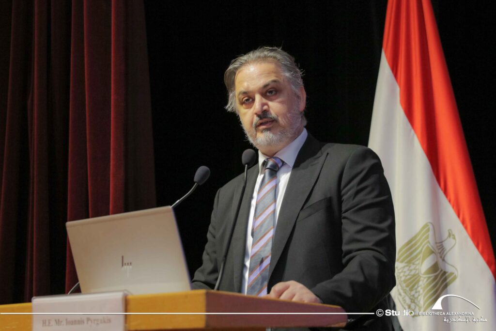 Από την πλευρά του, ο έτερος συνδιοργανωτής κ. Ιωάννης Πυργάκης, Γενικός Πρόξενος της Ελλάδας στην Αλεξάνδρεια, επιβεβαίωσε ότι «η πόλη της Αλεξάνδρειας είναι στενά συνδεδεμένη με την ιστορική διαδρομή της ελληνικής γλώσσας από την Ελληνιστική εποχή, που έγινε μάρτυρας της μετάφρασης των ελληνικών γραπτών, απ’ τα οποία γραπτά των σημαντικότερων, προέκυψαν επιστήμονες και ερευνητές, ενώ η πόλη της Αλεξάνδρας κατέστη μάρτυρας των πρώτων μορφών αλληλεπίδρασης μεταξύ ελληνικών, κοπτικών γλωσσών και μετά αραβικών».