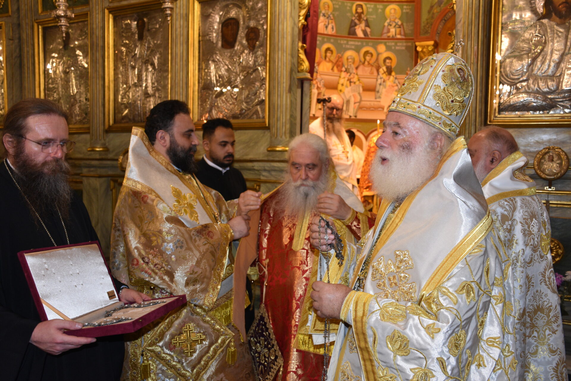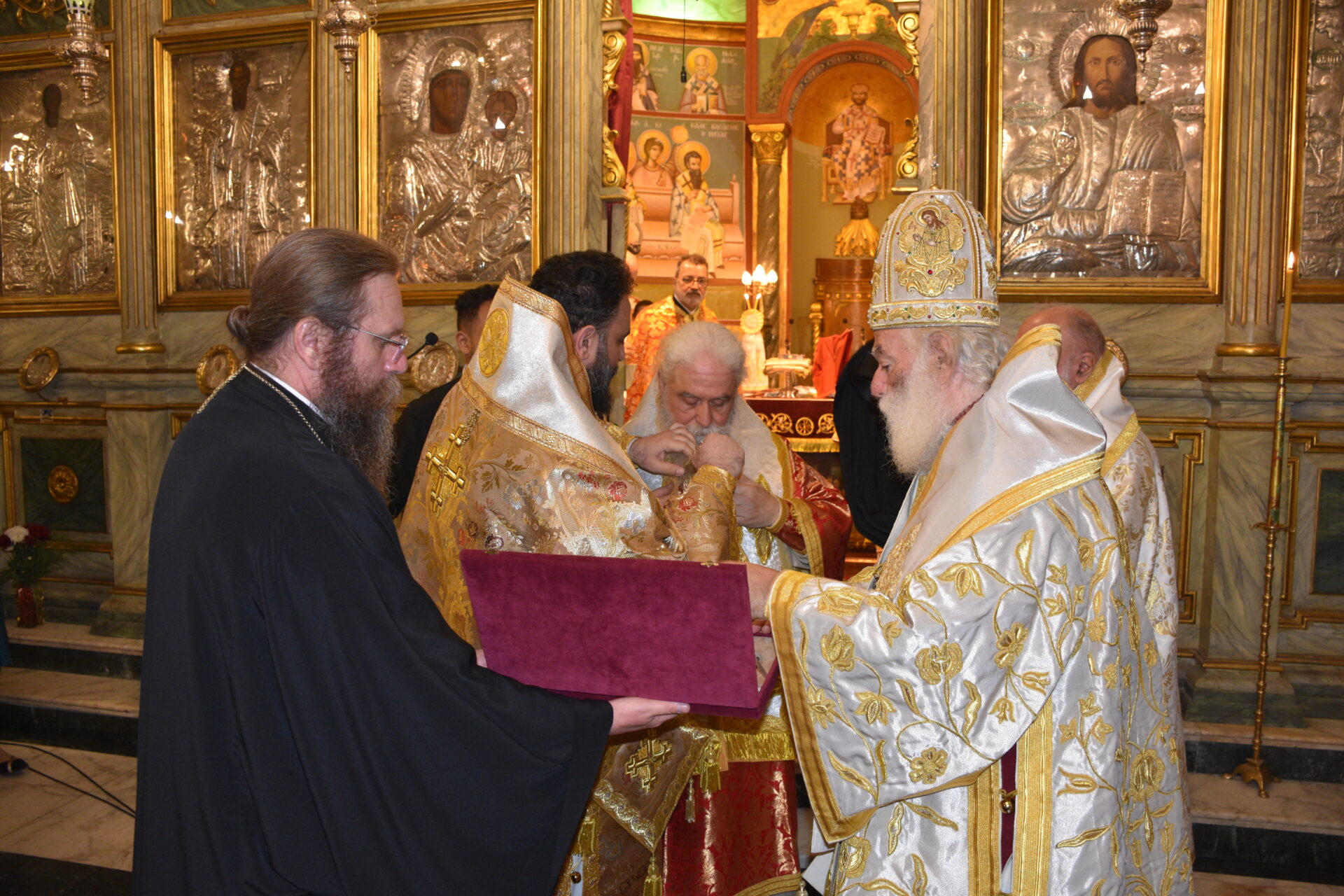 Κατακλείοντας, ο Μακαριώτατος προσέφερε στον Σεβασμιώτατο, ως ιδιαίτερη ευλογία και απτό σημείο πατρικής αγάπης, τα προσωπικά του Πατριαρχικά εγκόλπια, ώστε, όταν τα φέρει ιερουργών στην Ιερά Μονή της Αγίας Αικατερίνης του Θεοβαδίστου Όρους Σινά, να μνημονεύει στις προσευχές του το Παλαιφάτο Πατριαρχείο Αλεξανδρείας, όπως ο Κύριος, διά πρεσβειών της Αγίας Αικατερίνης, να στηρίξει και το μεγάλο ιεραποστολικό και φιλανθρωπικό έργο που επιτελείται στην Αφρικανική ήπειρο.