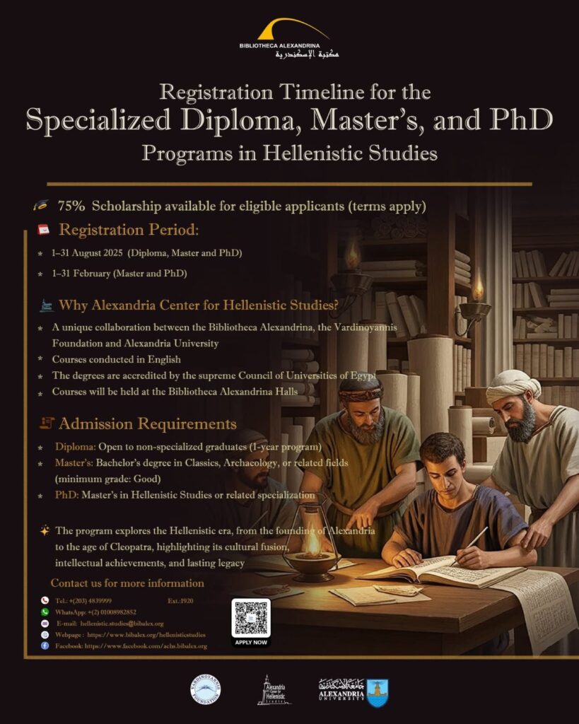 ​Το Κέντρο Ελληνιστικών Σπουδών Αλεξάνδρειας, υπαγόμενο στον Τομέα Ακαδημαϊκής Έρευνας της Βιβλιοθήκης της Αλεξάνδρειας, με χαρά ανακοινώνει την έναρξη των εγγραφών για τα προγράμματα Master και PhD στις Ελληνιστικές Σπουδές που προσφέρονται από το Πανεπιστήμιο της Αλεξάνδρειας.