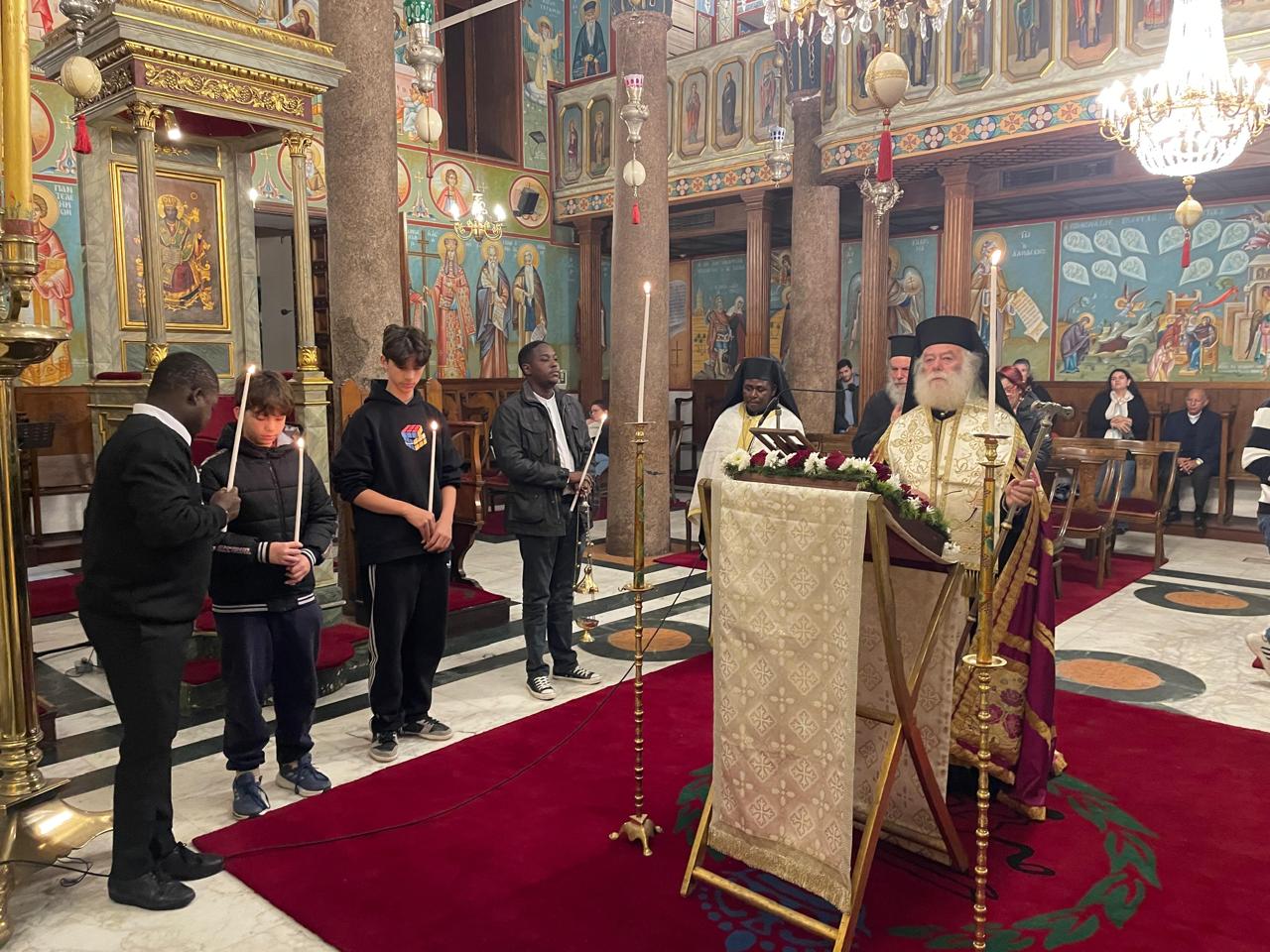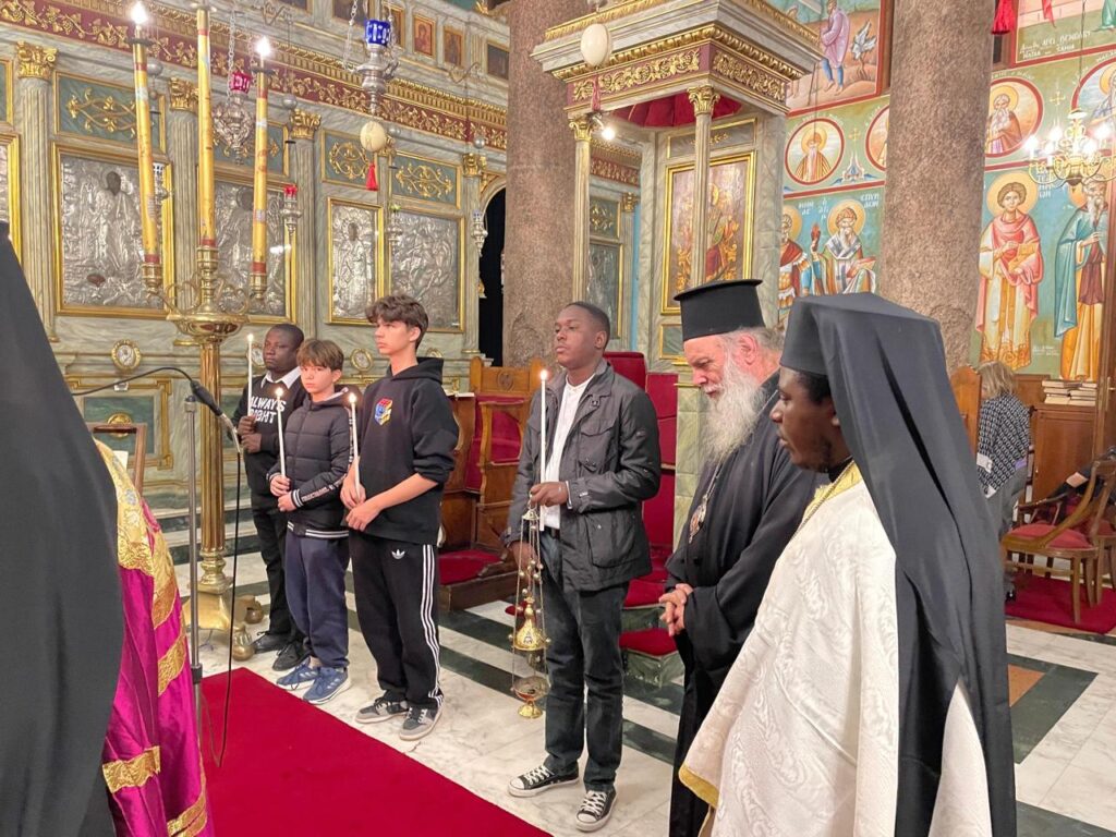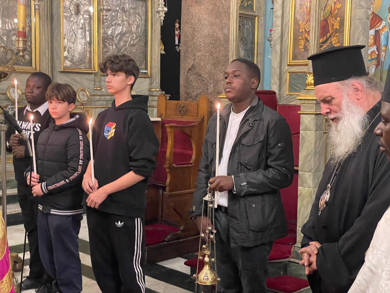 Συμπροσευχόμενοι, ο Πανιερώτατος Μητροπολίτης και Προϊστάμενος της ως άνω Μονής κ. Γερμανός και ο Πανοσιολογιώτατος Αρχιμανδρίτης κ. Μάρκος, με την “εκπαιδευτική αρωγή” των νέων μαθητών της Πατριαρχικής Σχολής Άγιος Αθανάσιος.
