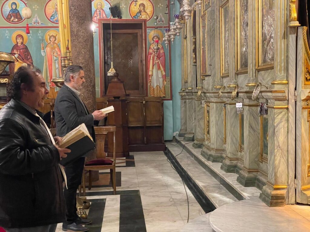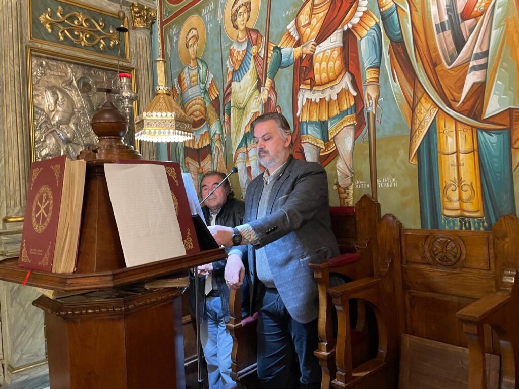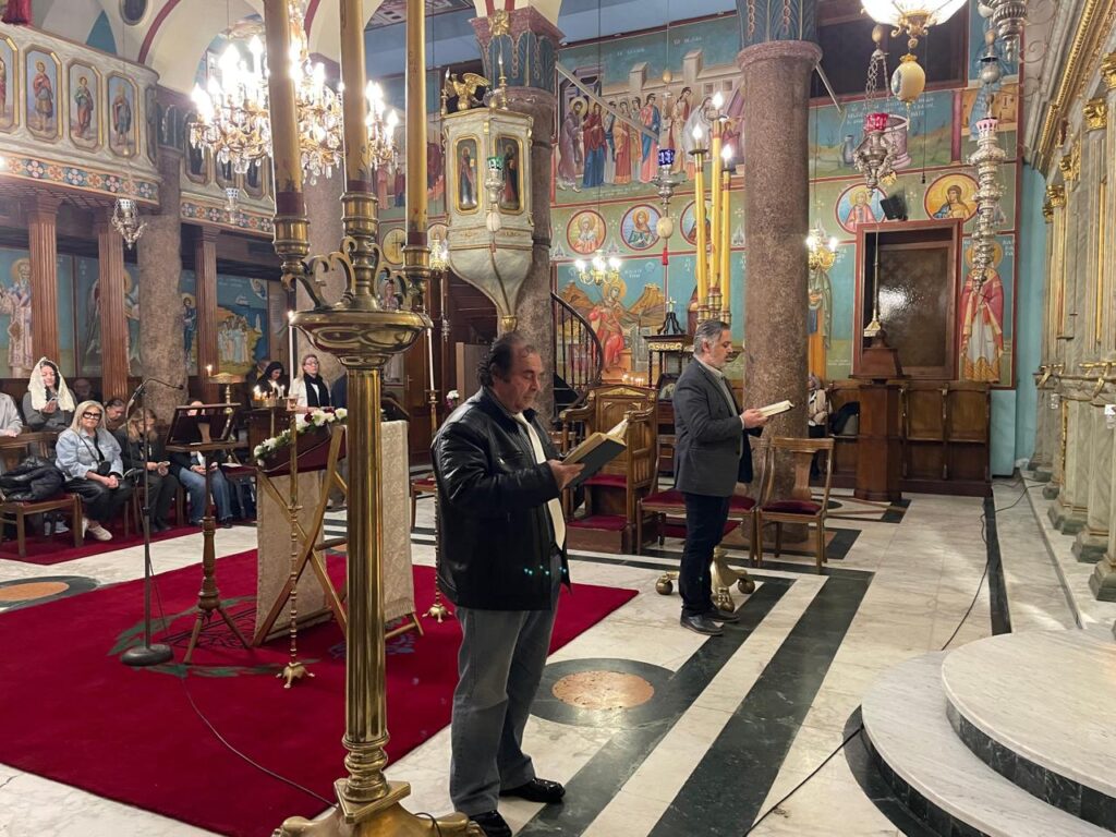 Ο Γενικός Πρόξενος της Ελλάδας στην Αλεξάνδρεια κ. Ιωάννης Πυργάκης, με την βυζαντινή του ιεροψαλτική γνώση, σπουδή και κατάρτιση, δημιούργησε συγκίνηση με τους θείους ύμνους, με συμπαραστάτη, τον μουσικό – ιεροψάλτη κ. Ιωάννη Γενειατάκη.