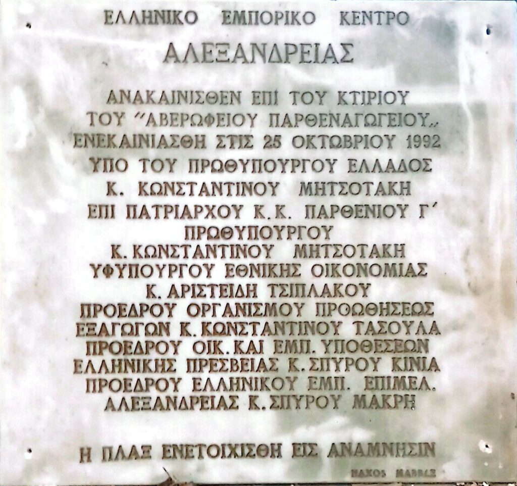 Να σημειωθεί ότι η προηγούμενη ανακαίνιση του κτηρίου για την χρήση του ελληνικού εμπορικού κέντρου Αλεξανδρείας πραγματοποιήθηκε το 1992, επί Πατριάρχου Αλεξανδρείας και πάσης Αφρικής κυρού Παρθενίου Γ’ και με την υψηλή παρουσία και τη γενναιόδωρη χορηγία του τότε Πρωθυπουργού της Ελλάδος Κωνσταντίνου Μητσοτάκη.