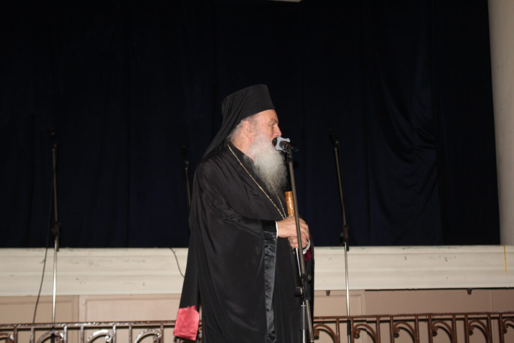 Η έναρξη της καλλιτεχνικής τελετουργίας, ορίστηκε με τον χαιρετισμό του   Πανιερωτάτου Μητροπολίτου Ταμιάθεως κ. Γερμανού, Προϊσταμένου της Ιεράς Μονής του Οσίου Σάββα του Ηγιασμένου, δηλώνοντας τα κάτωθι: «Εδώ στην Πόλη του Μεγάλου Αλεξάνδρου τα πάντα μοσχομυρίζουν και ευωδιάζουν την εποχή του. Από τους Πτολεμαίους μέχρι και σήμερα που είναι η πόλις του Αποστόλου και Ευαγγελιστού Μάρκου και η έδρα του Πατριαρχείου Αλεξανδρείας και πάσης Αφρικής. Αυτή την ώρα ο Πατριάρχης Αλεξανδρείας και πάσης Αφρικής βρίσκεται σε μεγάλη περιοδεία την οποία τώρα εκτελεί, βρίσκεται στο Κονγκό και σε λίγες μέρες θα μας έρθει. Μεταφέρει το φως του Χριστού, το φως του Αποστόλου Μάρκου, το φως το πνευματικό του φάρου της Αλεξάνδρειας σε όλα τα μήκη και τα πλάτη όχι μόνο της Αφρικής αλλά και σε ολόκληρο τον κόσμο. Εκ μέρους του λοιπόν καθώς έχω τη μεγάλη τιμή να τον εκπροσωπώ σ΄ αυτή τη μεγάλη γιορτή της Εθνικής Παλιγγενεσίας και του Εορτασμού του Ευαγγελισμού της Θεοτόκου, σας καλωσορίζουμε, σας ευχαριστούμε και συγκινούμαστε πάρα πολύ γιατί ενώ έχουν περάσει 205 χρόνια από την ημέρα της Παλιγγενεσίας αυτός ο παλμός βρίσκεται ζωντανός και ακούγεται «Τη Υπερμάχω Στρατηγώ τα νικητήρια…», ακούγεται ο Εθνικός Ύμνος, ακούγονται και του Φεραίου οι ύμνοι και όλα αυτά τα οποία πλημμυρίζουν και είναι ζωντανό παρόν και ελπίδα του μέλλοντος. Και με ξεχωριστή χαρά περιμένουμε και το δικό σας εκλεκτό πρόγραμμα.  Καλώς μας ήρθατε, χρόνια πολλά και ευλογημένα, η Παναγία να σας ευλογεί. Αμήν”.