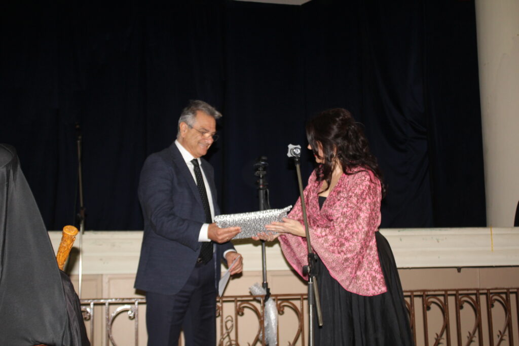 Στη συνέχεια η ιδρύτρια και εμπνεύστρια  του Συλλόγου «Δικηγόροι εν χορώ», κα. Σεβαστιανή Νεονάκη, προσκάλεσε τιμητικώς τον Αντιπρόεδρο Α΄ της Ελληνικής Κοινότητας Αλεξανδρείας κ. Ιωάννη Παπαδόπουλο,  για να του προσφέρει αναμνηστικό δώρο, ως δείγμα εκτίμησης, τιμής  και ευχαριστιών για τη συνεργασία και την φιλοξενία εκ μέρους της ΕΚΑ. Μάλιστα ανέφερε προς τούτο τα εξής: Έχουμε ως ενθύμιο ένα δώρο για εσάς κ. Αντιπρόεδρε, ένα βιβλίο αφιέρωμα στην ελληνική παραδοσιακή ενδυμασία το οποίο εξεδόθη από το Μουσείο Μπενάκη και παρακαλώ πολύ να το δεχτείτε εκπροσωπώντας την Ελληνική Κοινότητα Αλεξανδρείας».