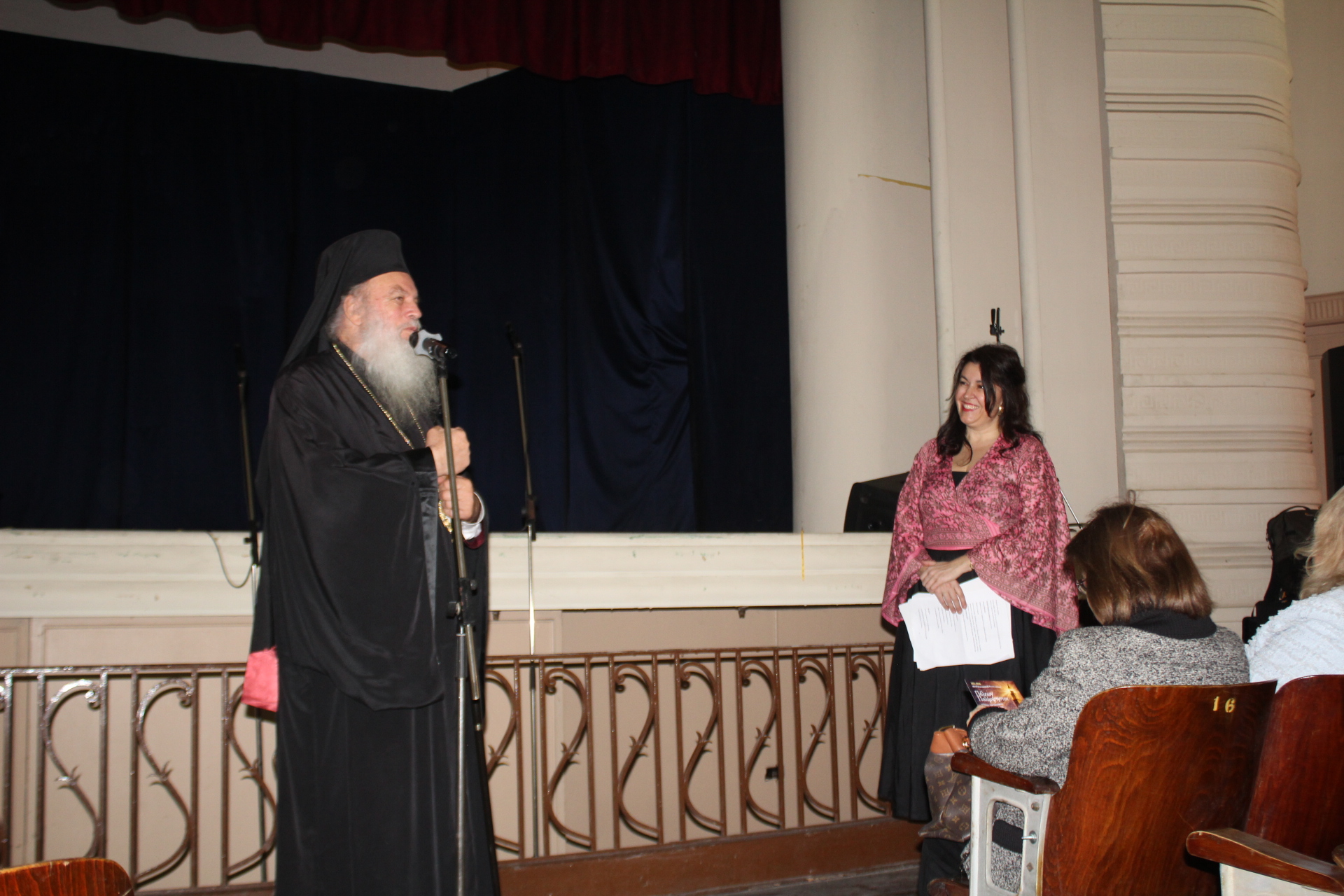 Η έναρξη της καλλιτεχνικής τελετουργίας, ορίστηκε με τον χαιρετισμό του   Πανιερωτάτου Μητροπολίτου Ταμιάθεως κ. Γερμανού, Προϊσταμένου της Ιεράς Μονής του Οσίου Σάββα του Ηγιασμένου, δηλώνοντας τα κάτωθι: «Εδώ στην Πόλη του Μεγάλου Αλεξάνδρου τα πάντα μοσχομυρίζουν και ευωδιάζουν την εποχή του. Από τους Πτολεμαίους μέχρι και σήμερα που είναι η πόλις του Αποστόλου και Ευαγγελιστού Μάρκου και η έδρα του Πατριαρχείου Αλεξανδρείας και πάσης Αφρικής. Αυτή την ώρα ο Πατριάρχης Αλεξανδρείας και πάσης Αφρικής βρίσκεται σε μεγάλη περιοδεία την οποία τώρα εκτελεί, βρίσκεται στο Κονγκό και σε λίγες μέρες θα μας έρθει. Μεταφέρει το φως του Χριστού, το φως του Αποστόλου Μάρκου, το φως το πνευματικό του φάρου της Αλεξάνδρειας σε όλα τα μήκη και τα πλάτη όχι μόνο της Αφρικής αλλά και σε ολόκληρο τον κόσμο. Εκ μέρους του λοιπόν καθώς έχω τη μεγάλη τιμή να τον εκπροσωπώ σ΄ αυτή τη μεγάλη γιορτή της Εθνικής Παλιγγενεσίας και του Εορτασμού του Ευαγγελισμού της Θεοτόκου, σας καλωσορίζουμε, σας ευχαριστούμε και συγκινούμαστε πάρα πολύ γιατί ενώ έχουν περάσει 205 χρόνια από την ημέρα της Παλιγγενεσίας αυτός ο παλμός βρίσκεται ζωντανός και ακούγεται «Τη Υπερμάχω Στρατηγώ τα νικητήρια…», ακούγεται ο Εθνικός Ύμνος, ακούγονται και του Φεραίου οι ύμνοι και όλα αυτά τα οποία πλημμυρίζουν και είναι ζωντανό παρόν και ελπίδα του μέλλοντος. Και με ξεχωριστή χαρά περιμένουμε και το δικό σας εκλεκτό πρόγραμμα.  Καλώς μας ήρθατε, χρόνια πολλά και ευλογημένα, η Παναγία να σας ευλογεί. Αμήν”.