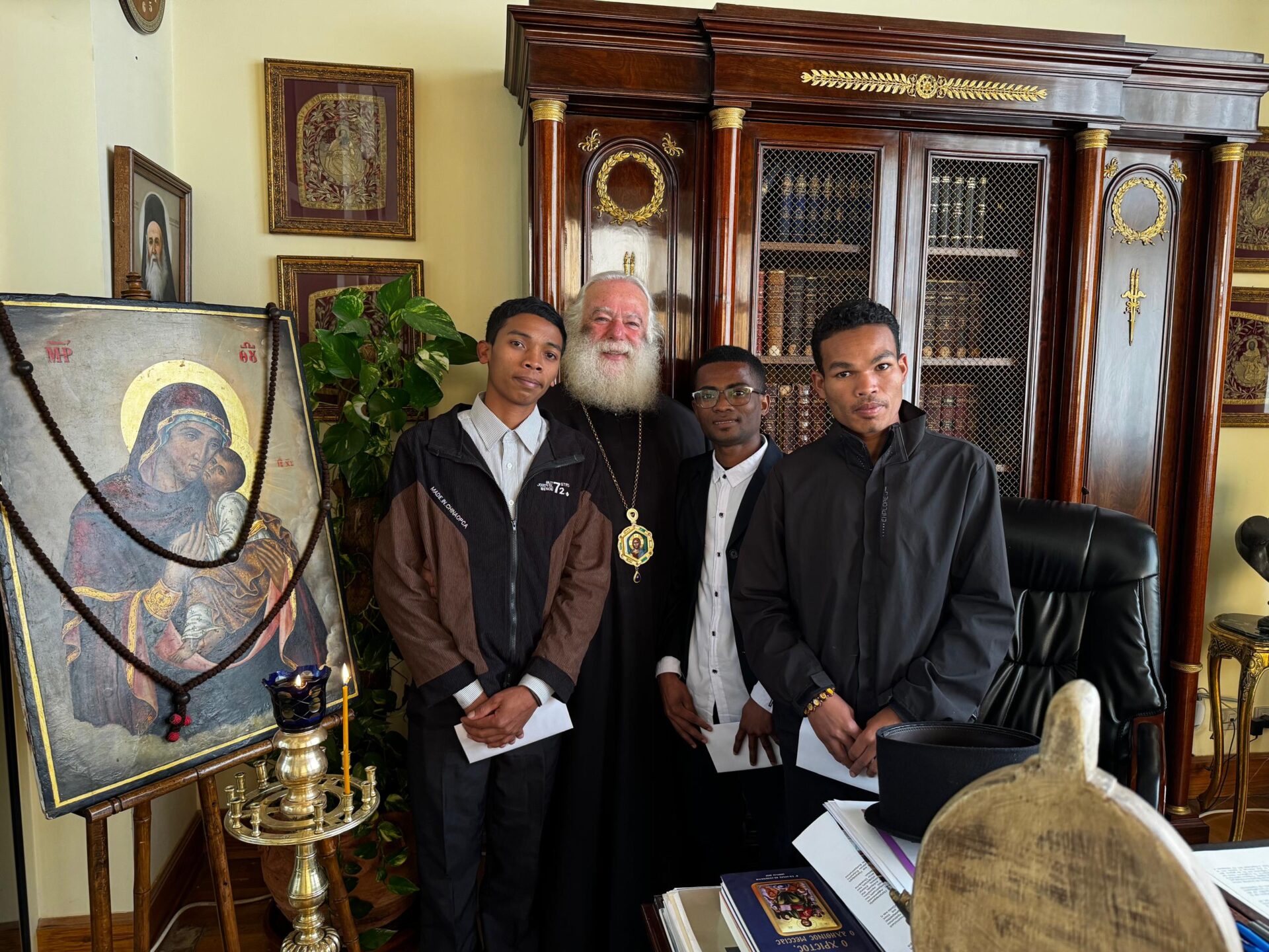 Το ίδιο απόγευμα, ο Μακαριώτατος δέχθηκε τρεις νέους φοιτητές της Πατριαρχικής Σχολής του Αγίου Αθανασίου στην Αλεξάνδρεια, προερχόμενους εκ της Μαδαγασκάρης και συγκεκριμένα εκ της Ιεράς Μητροπόλεως Ανταναναρίβο και Κεντρικής Μαδαγασκάρης, οι οποίοι προσφάτως αφίχθησαν στην Αλεξάνδρεια, προκειμένου να λάβουν την πατριαρχική ευχή για την έναρξη των σπουδών τους.