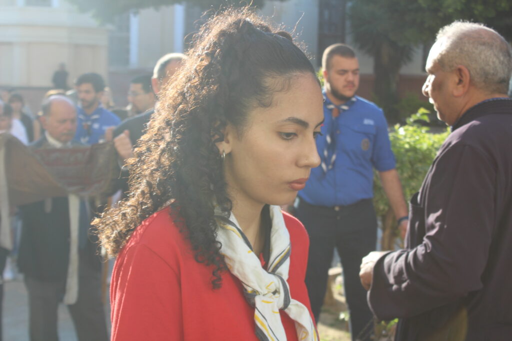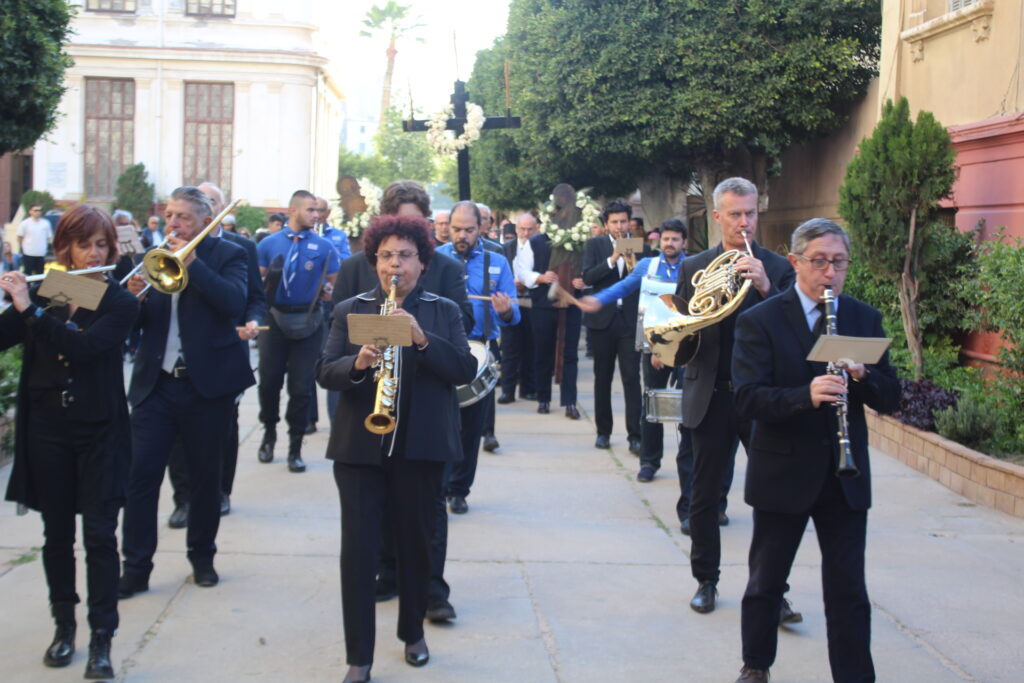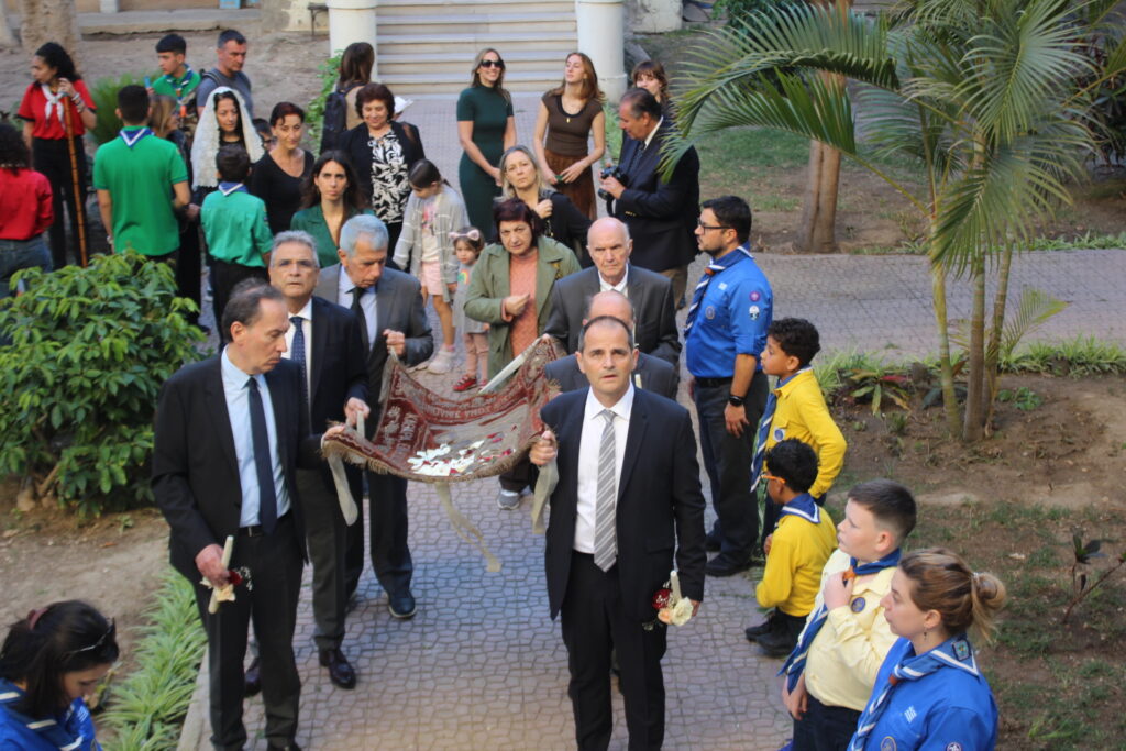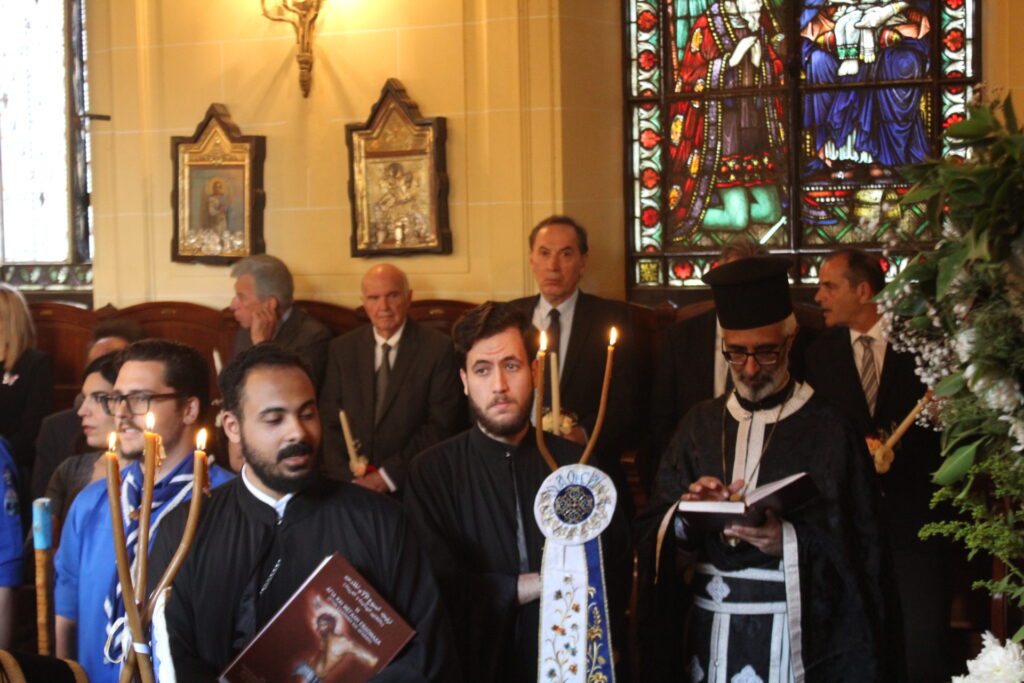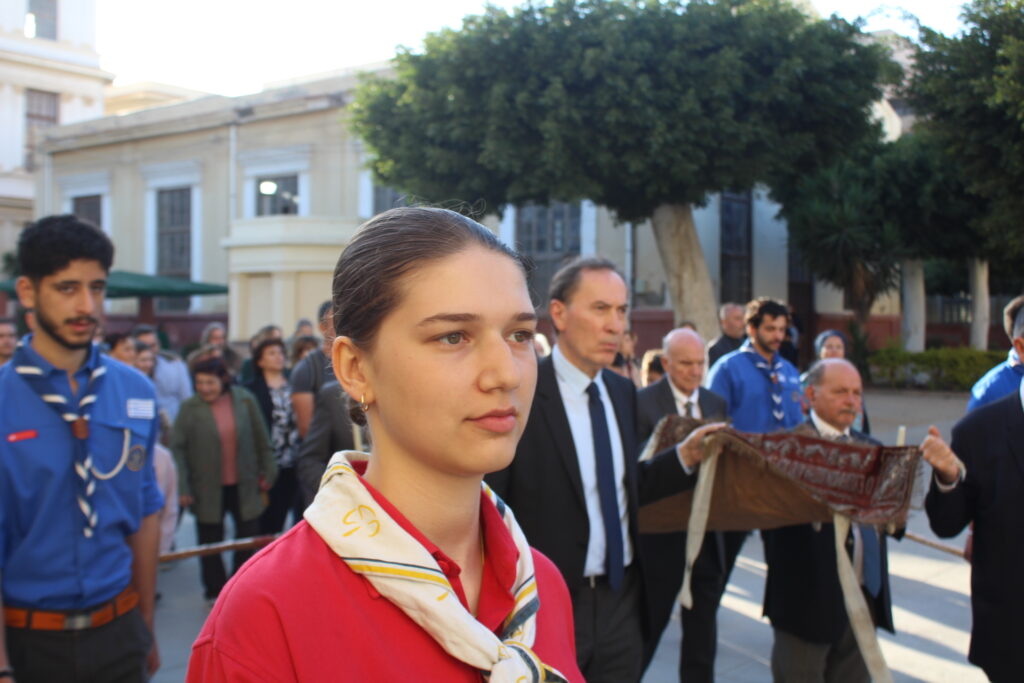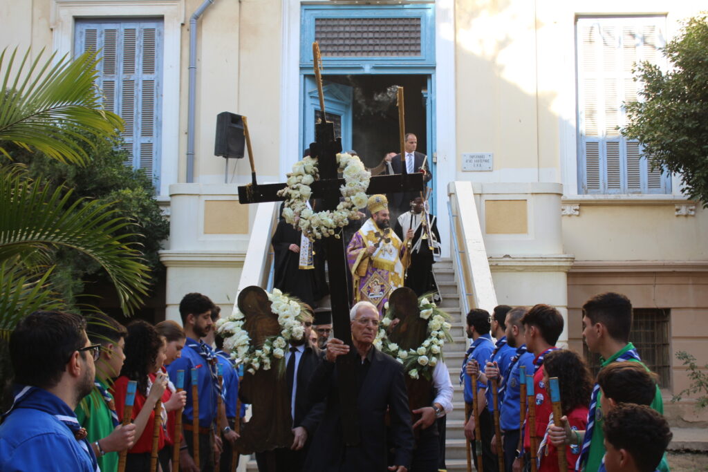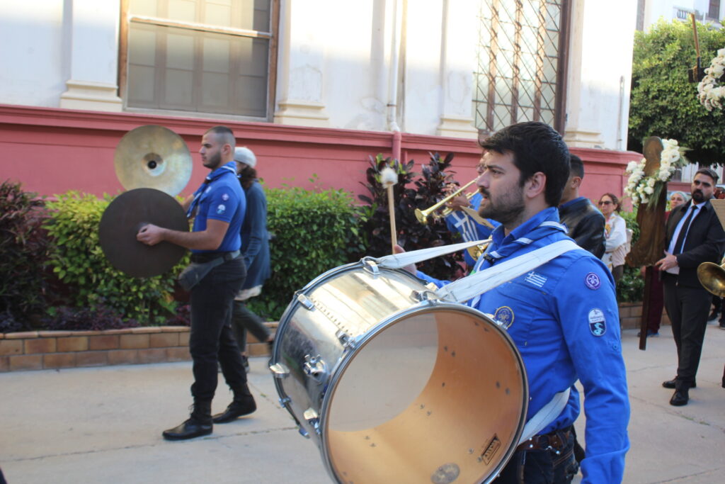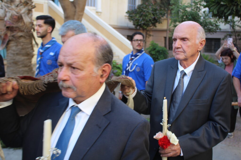 Το Ελληνικό Τετράγωνο ξαναγύρισε στο όχι και τόσο μακρινό παρελθόν – της ένδοξης εποχής, που έσφυζε από ζωή. Οι πιστοί της παροικίας προσήλθαν με ευλάβεια να συμμετάσχουν στην πλέον κατανυκτική στιγμή της Μεγάλης Εβδομάδας, του Αγίου Επιταφίου. Πρόσκοποι, φιλαρμονική, θεσμικοί εκπρόσωποι και πάροικοι Αιγυπτιώτες ήταν όλοι τους εκεί στον Ιερό Ναό της Αγίας Αικατερίνης του Μπενακείου συγκροτήματος. Τού όλου ιερού τελετουργικού προεξήρχε ο Θεοφιλέστατος Επίσκοπος Μαρεώτιδος κ. Δαμασκηνός, Πατριαρχικός Επίτροπος, ενδεδυμένος τα άμφια που άρμοζαν και αναλογούσαν στην Ακολουθία του Επιταφίου, προσδίδοντας με το λόγο του και την παρουσία του, τη μελαγχολία που δημιουργεί η θλιμμένη ημέρα της Μεγάλης Παρασκευής. Μαζί του συμπροσευχόμενοι οι κληρικοί της Πατριαρχικής Αυλής.
