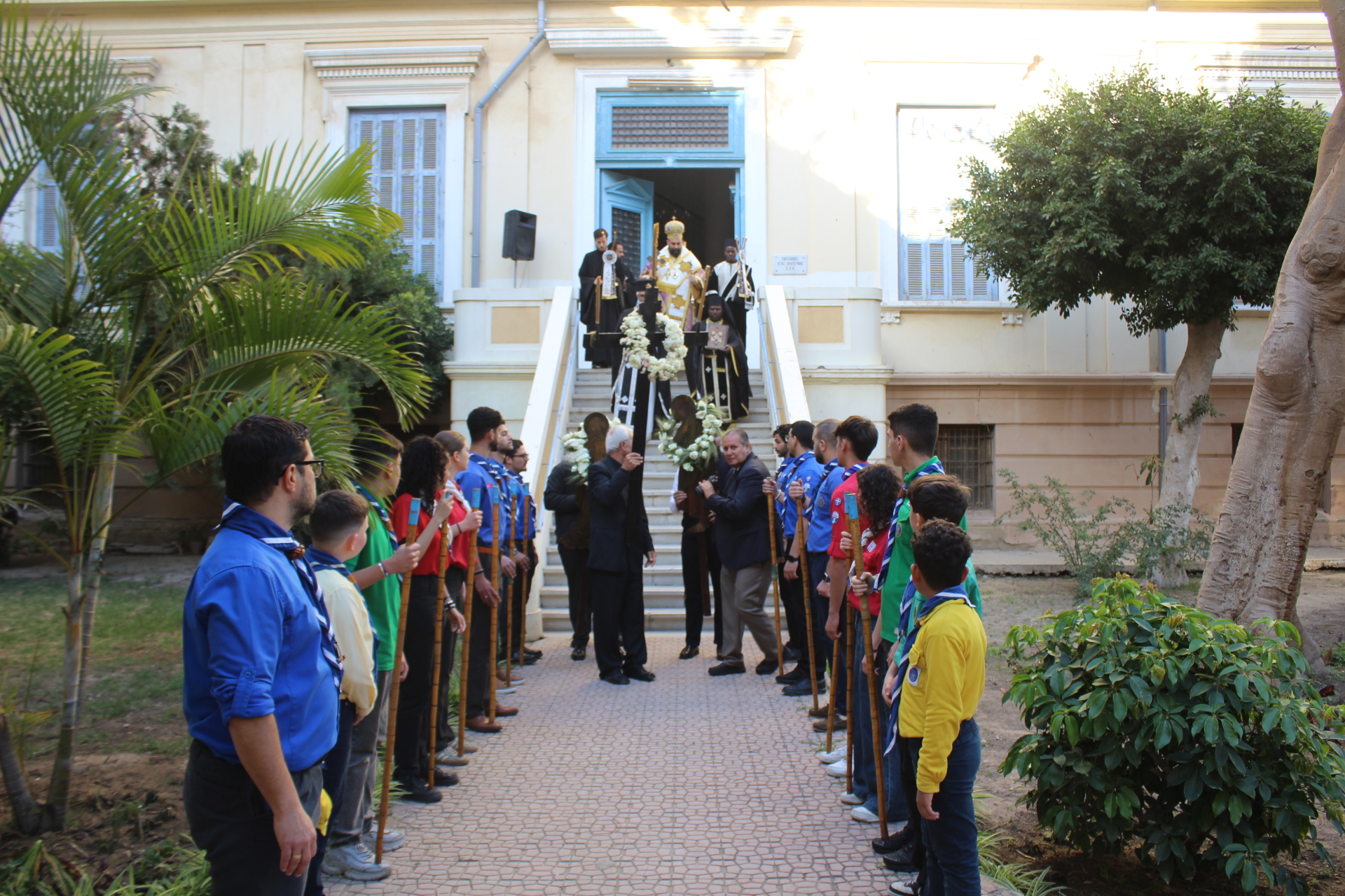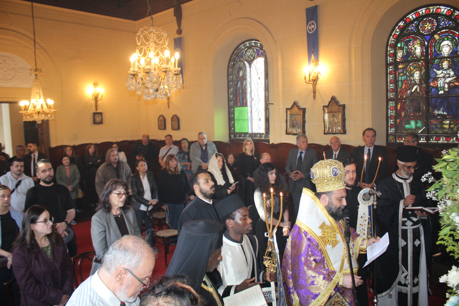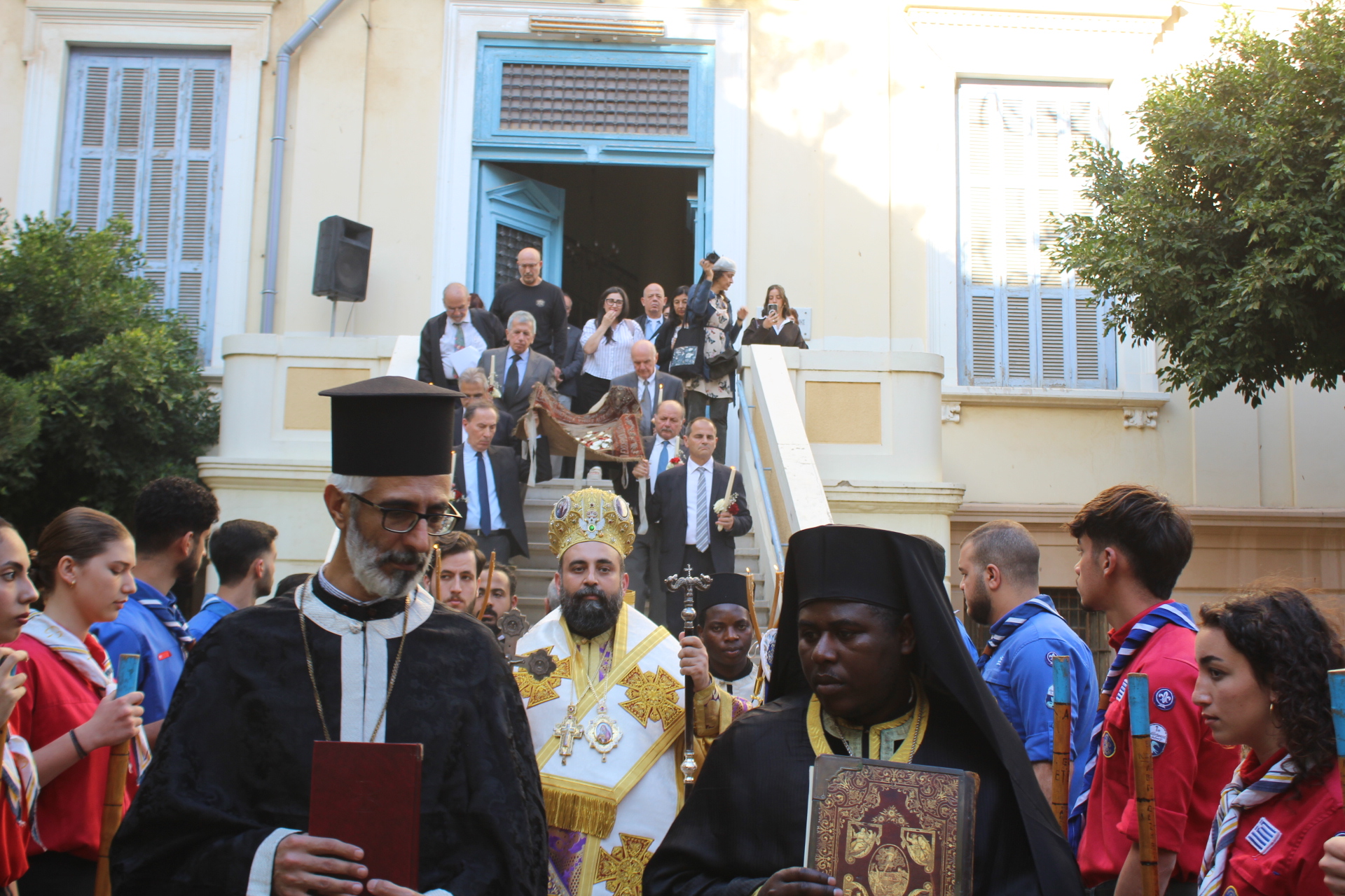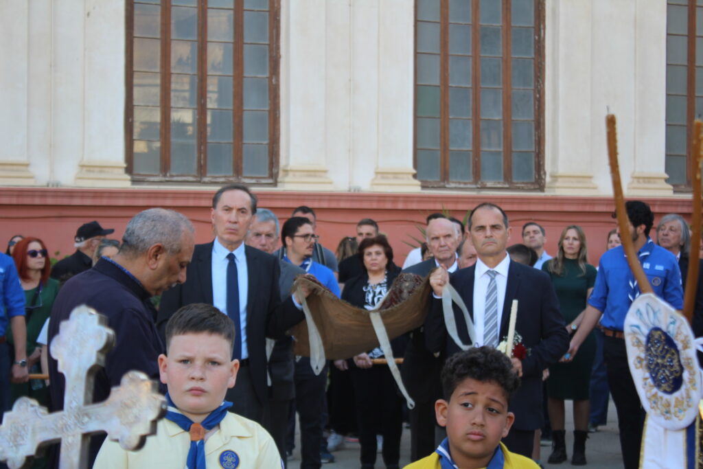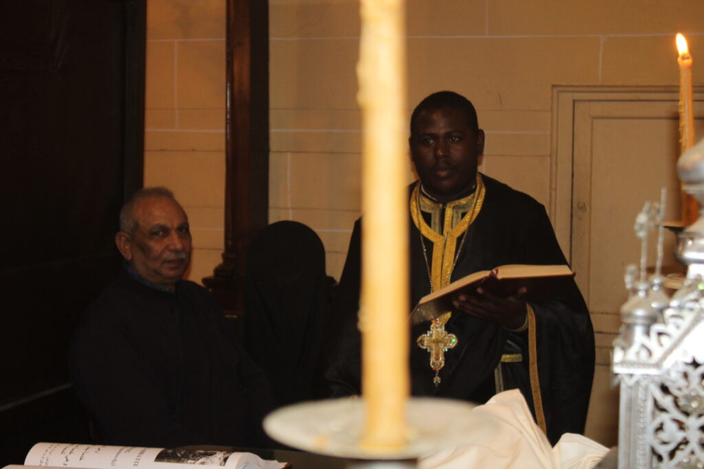 Το Ελληνικό Τετράγωνο ξαναγύρισε στο όχι και τόσο μακρινό παρελθόν – της ένδοξης εποχής, που έσφυζε από ζωή. Οι πιστοί της παροικίας προσήλθαν με ευλάβεια να συμμετάσχουν στην πλέον κατανυκτική στιγμή της Μεγάλης Εβδομάδας, του Αγίου Επιταφίου. Πρόσκοποι, φιλαρμονική, θεσμικοί εκπρόσωποι και πάροικοι Αιγυπτιώτες ήταν όλοι τους εκεί στον Ιερό Ναό της Αγίας Αικατερίνης του Μπενακείου συγκροτήματος. Τού όλου ιερού τελετουργικού προεξήρχε ο Θεοφιλέστατος Επίσκοπος Μαρεώτιδος κ. Δαμασκηνός, Πατριαρχικός Επίτροπος, ενδεδυμένος τα άμφια που άρμοζαν και αναλογούσαν στην Ακολουθία του Επιταφίου, προσδίδοντας με το λόγο του και την παρουσία του, τη μελαγχολία που δημιουργεί η θλιμμένη ημέρα της Μεγάλης Παρασκευής. Μαζί του συμπροσευχόμενοι οι κληρικοί της Πατριαρχικής Αυλής.