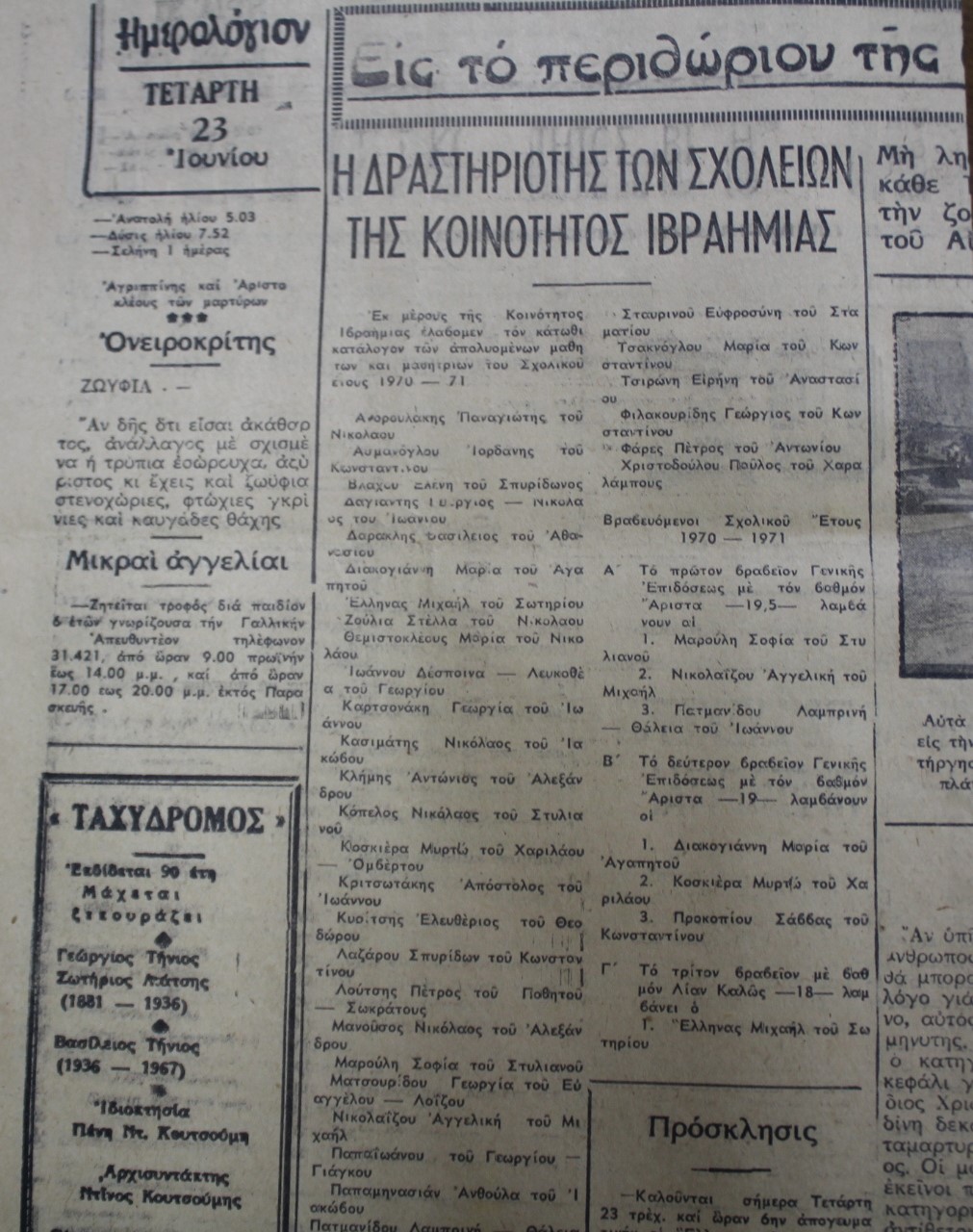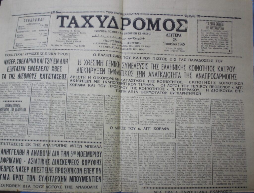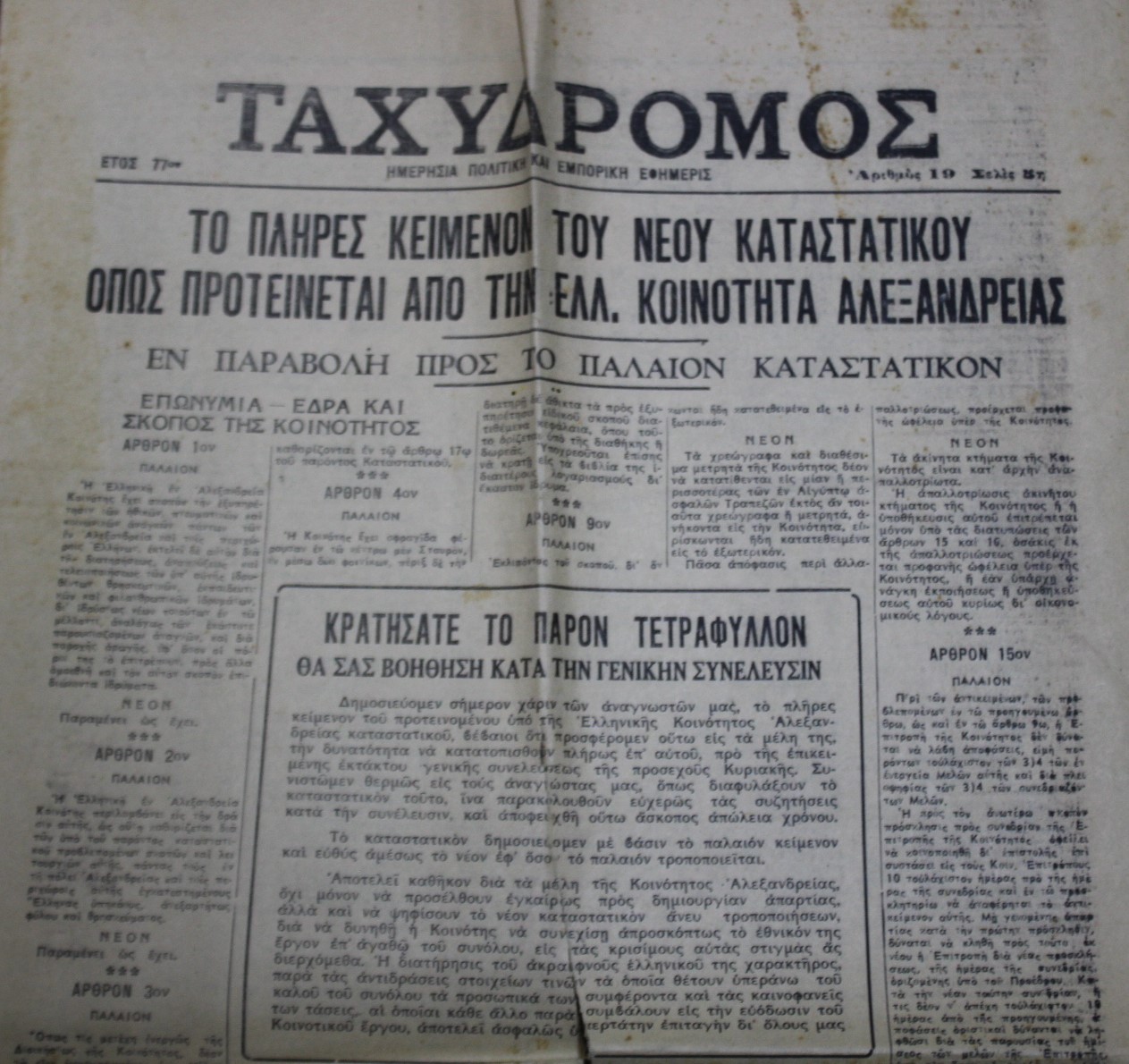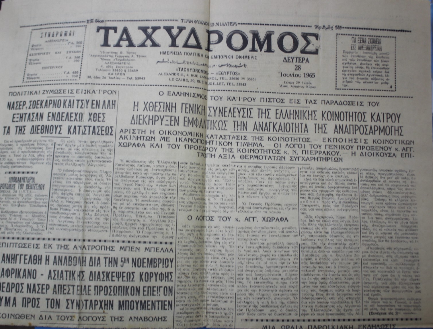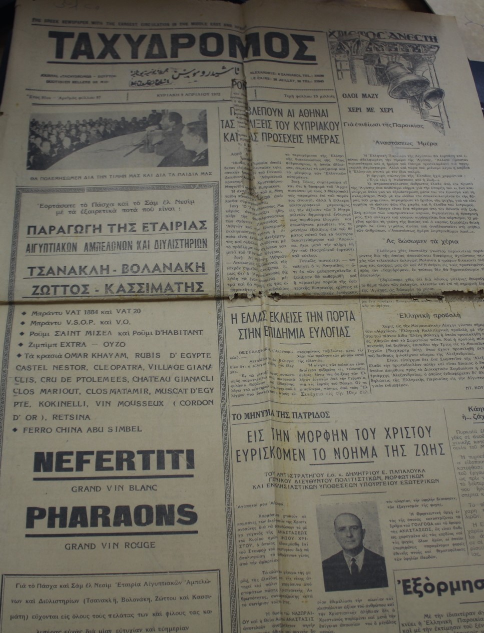 Μας παρέδωσε ένα αρχείο με παλιές εκδόσεις του ημερήσιου  “Ταχυδρόμου” παλαιότερων δεκαετιών, όπως εποχής Μεσοπολέμου και άλλες μετέπειτα ημερομηνίες, όπου εκεί παρατηρούμε συμβάντα του Αβερωφείου Σχολείου, κοινωνικά θέματα που αφορούν την Αλεξάνδρεια, Καταστατικό της Ελληνικής Κοινότητας Αλεξανδρείας, Συνελεύσεις του Καίρου μέχρι και τιμωρίες από την πλευρά των καθηγητών προς τους απείθαρχους μαθητές.