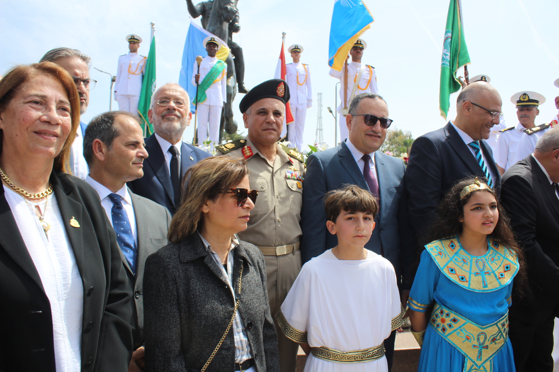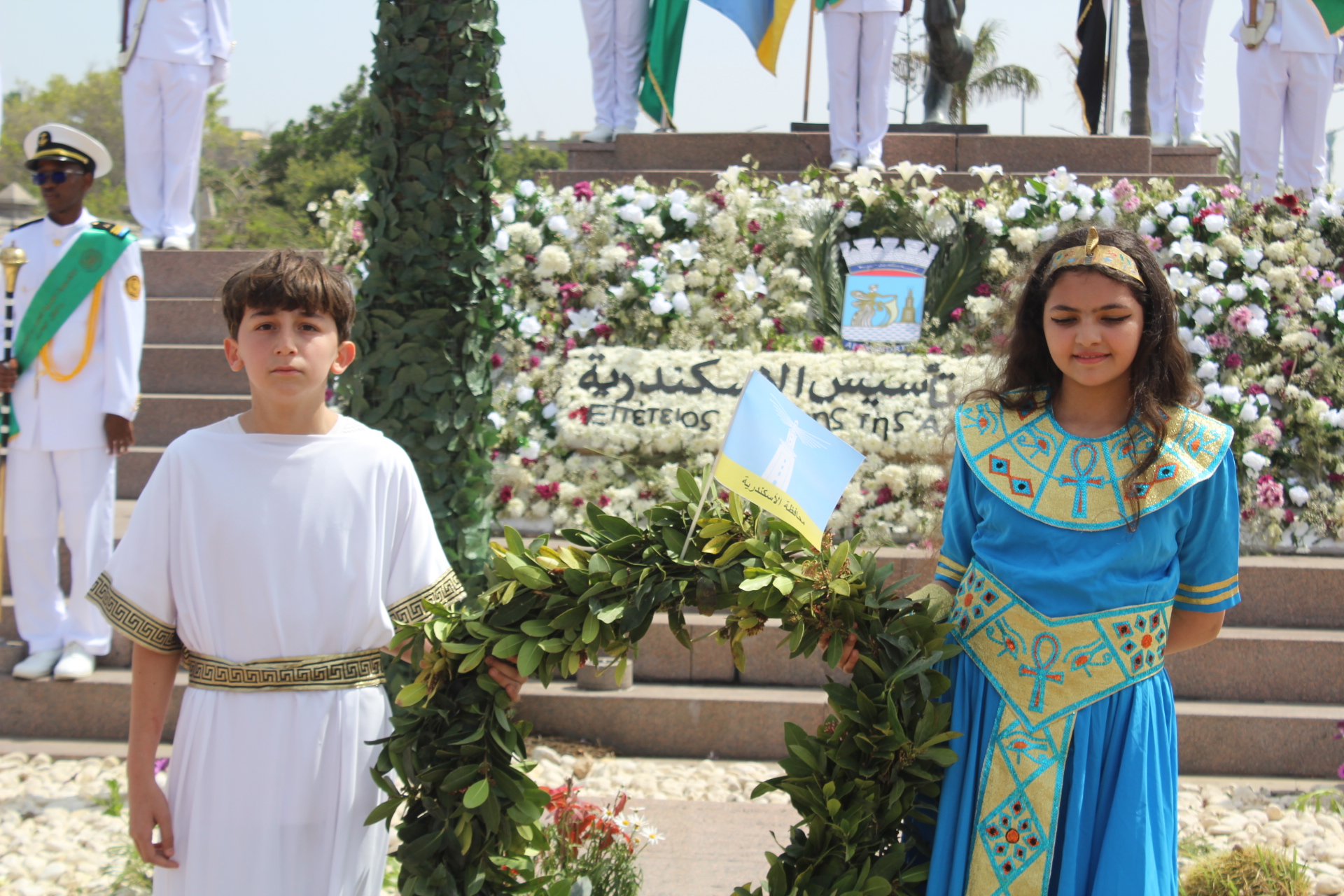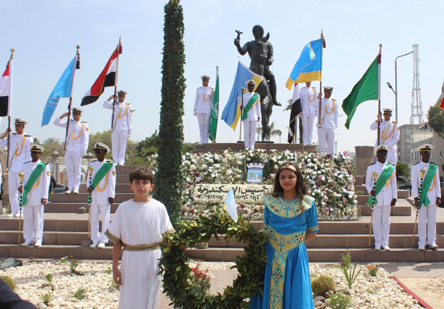 Παρουσία του Δρ Amira Yassen, Αντιπεριφερειάρχη Αλεξανδρείας, του Πρέσβη της Ελλάδας στο Κάϊρο κ. Νικόλαου Παπαγεωργίου, του Γενικού Προξένου της Ελλάδας στην Αλεξάνδρεια, κ. Ιωάννη Πυργάκη, του Διοικητή της Βόρειας Σημαίας Στρατηγού Bahri A.H. George Shawky, του Στρατηγού A.H. Osama Fouzi, Βοηθού Διοικητή της Βόρειας Περιφέρειας, του Προέδρου της Ελληνικής Κοινότητας κ. Ανδρέα Βαφειάδη, της Δρ Μόνα Hadj, Προέδρου της Αρχαιολογικής Εταιρείας στην Αλεξάνδρεια, της κας Καλλιόπης Παπακώστα, Διευθύντριας του Ινστιτούτου Έρευνας Ελληνικού και Αλεξανδρινού Πολιτισμού, διαφόρων Προξένων και πολιτειακών πρεσβευτών, πολλών μελών της Βουλής των Αντιπροσώπων και Γερουσιαστών, πέντε θρησκευτικών ηγετών, υψηλόβαθμων στελεχών της ασφάλειας, εκτελεστικών ηγετών της επαρχίας, καθώς και εκπροσώπων αιγυπτιακών και ελληνικών σωματείων και βέβαια πλήθος κόσμου, η πομπή ξεκίνησε έμπροσθεν του Ελληνορωμαϊκού Μουσείου και μέσω της οδού Φουάντ, κατέληξε στο άγαλμα του Μεγάλου Αλεξάνδρου στην πλατεία Ανθορολογιού.